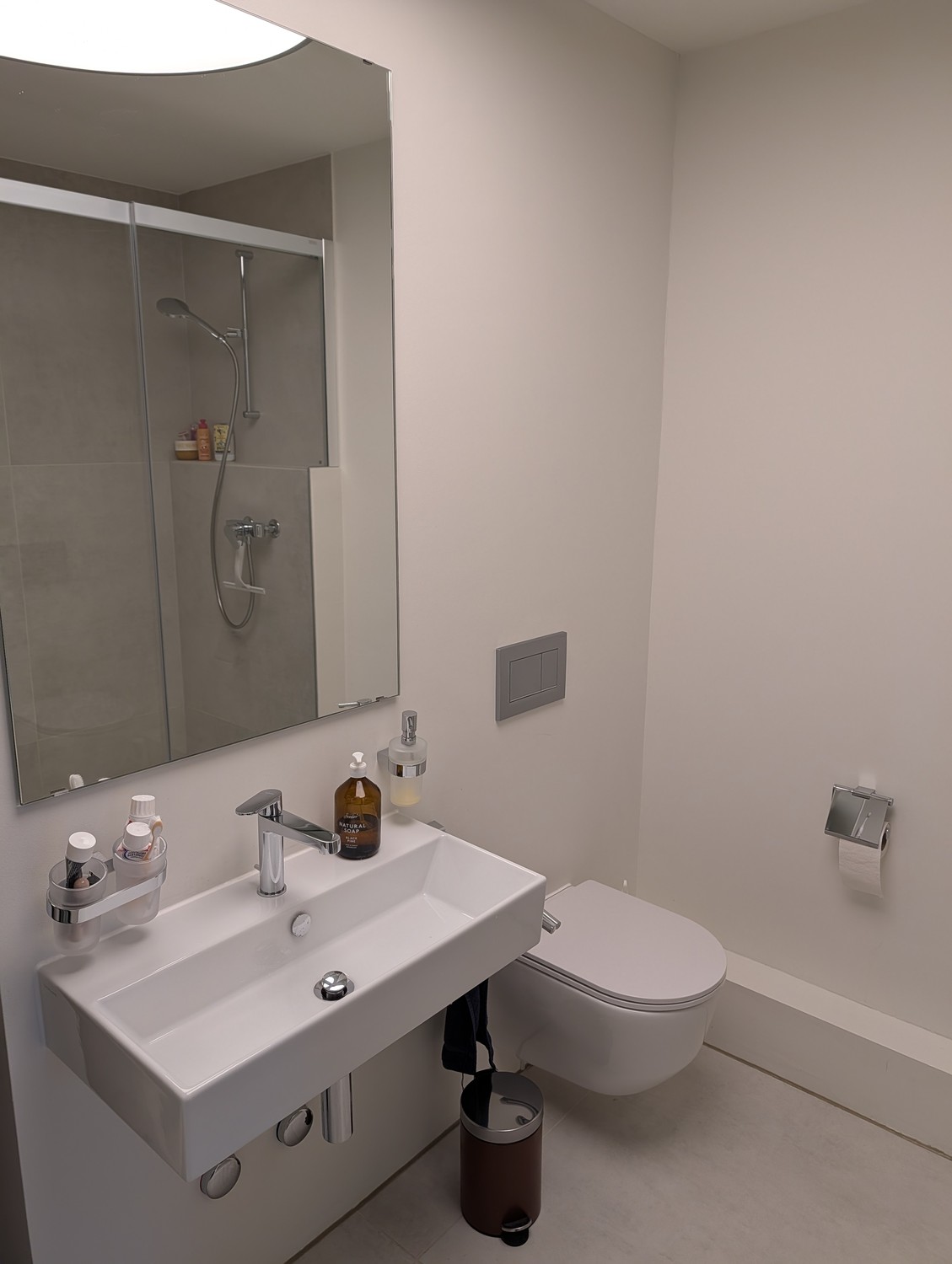 Everything at your doorstep: train station, large Coop (open Mon–Sat 6 am–10 pm), bakery downstairs, international restaurants, gym, daycare, laundry service, tailor, print shop, bars, and lovely local shops.