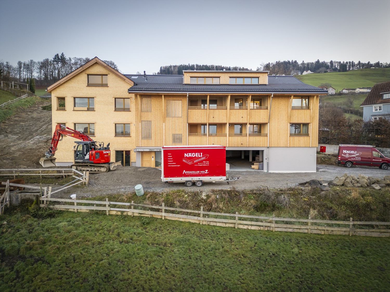 In der Fassade wiederspiegelt sich die regionale Baukultur, welche sich durch Schindeln, einer gestemmten Fassade und einem speziellen Deckleistenschirm auszeichnet. Die Aussenwände sind im Appenzeller Vollholzsystem gebaut. Dabei bestehen die Wände aus massiven, sägerohen Holzlagen, die ohne Leim oder Chemikalien verbunden sind. Dadurch entsteht ein Haus, das atmen kann. Es speichert im Winter die Wärme und bleibt im Sommer angenehm kühl. So bietet es ein äussert gesundes Wohnklima.