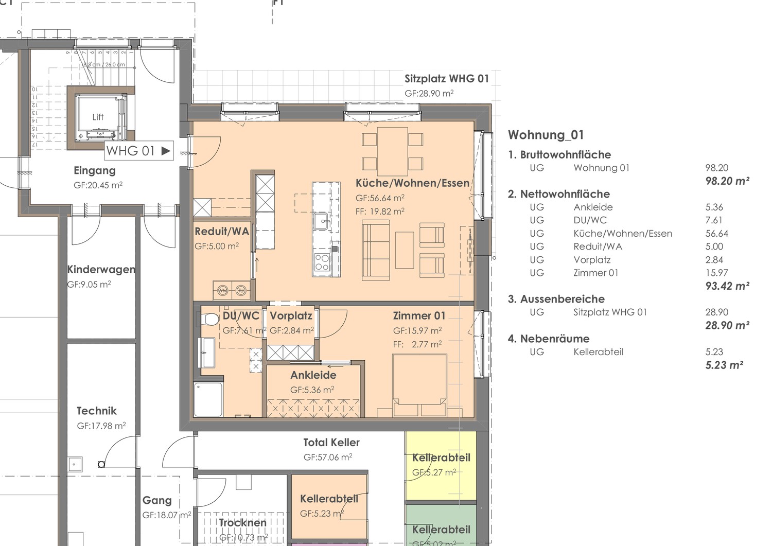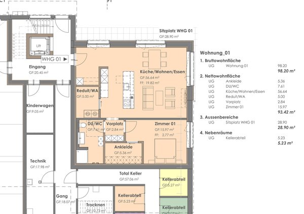 Im Innern gelangen Sie ebenerdig in eine grosse Tiefgarage mit angrenzendem Veloraum und separaten Kellerabteilen. Ein Treppenhaus mit Lift verbindet die zwei darüberliegenden Stockwerke.