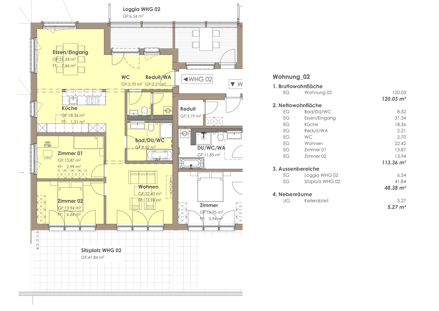 Im Innern gelangen Sie ebenerdig in eine grosse Tiefgarage mit angrenzendem Veloraum und separaten Kellerabteilen. Ein Treppenhaus mit Lift verbindet die zwei darüberliegenden Stockwerke.