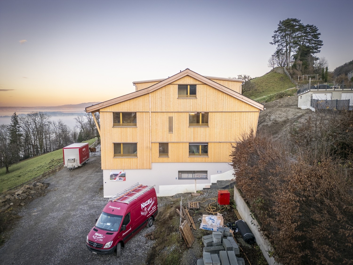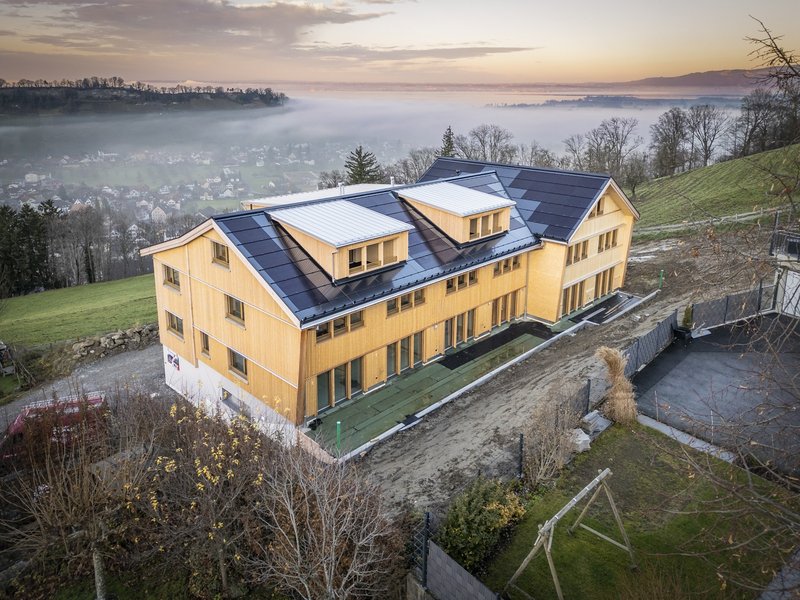 In der Fassade wiederspiegelt sich die regionale Baukultur, welche sich durch Schindeln, einer gestemmten Fassade und einem speziellen Deckleistenschirm auszeichnet. Die Aussenwände sind im Appenzeller Vollholzsystem gebaut. Dabei bestehen die Wände aus massiven, sägerohen Holzlagen, die ohne Leim oder Chemikalien verbunden sind. Dadurch entsteht ein Haus, das atmen kann. Es speichert im Winter die Wärme und bleibt im Sommer angenehm kühl. So bietet es ein äussert gesundes Wohnklima.