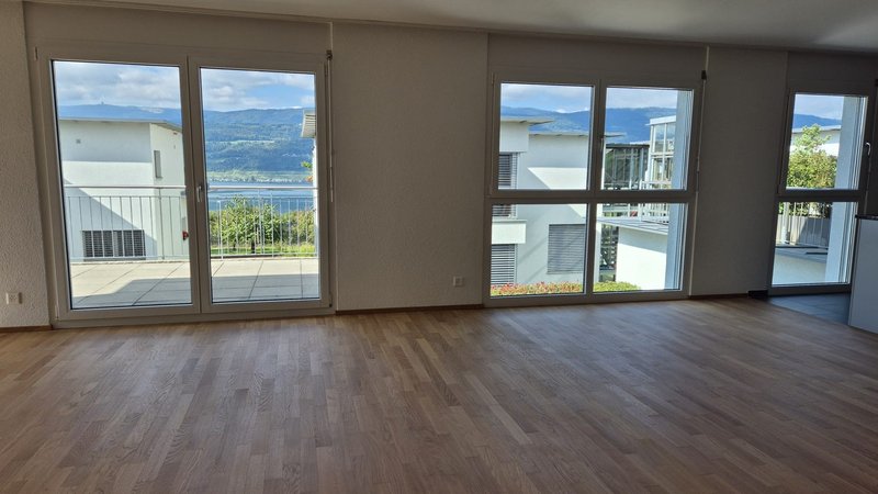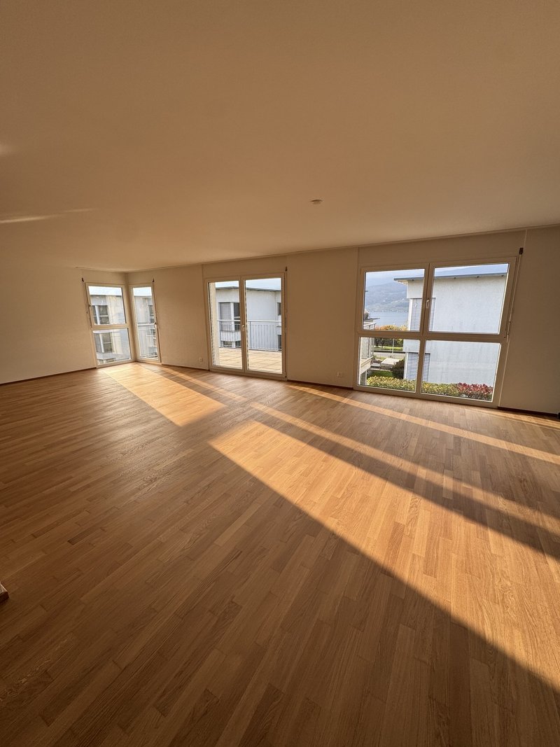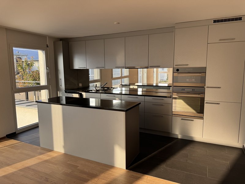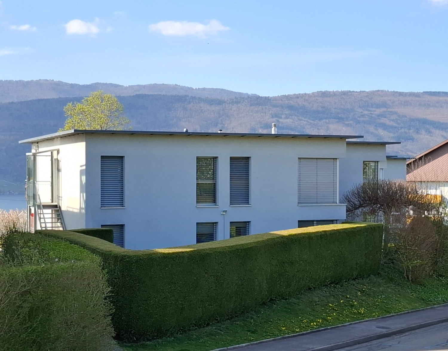 Der sonnige Balkon (Südwest-Ausrichtung) mit elektrischer Markise bietet nicht nur Teilsicht auf den Bielersee und den Chasseral, sondern auch den besonderen Charme der obersten Etage.