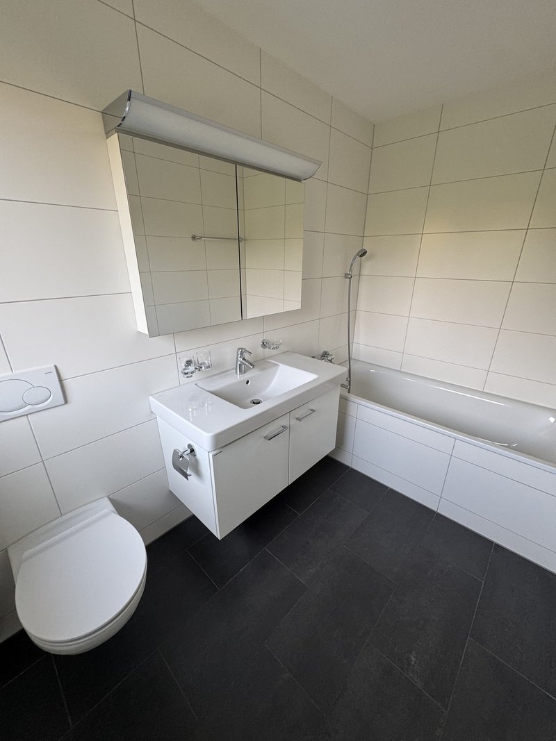 Ein modern ausgestattetes Tageslichtbad mit Badewanne- angrenzend an das