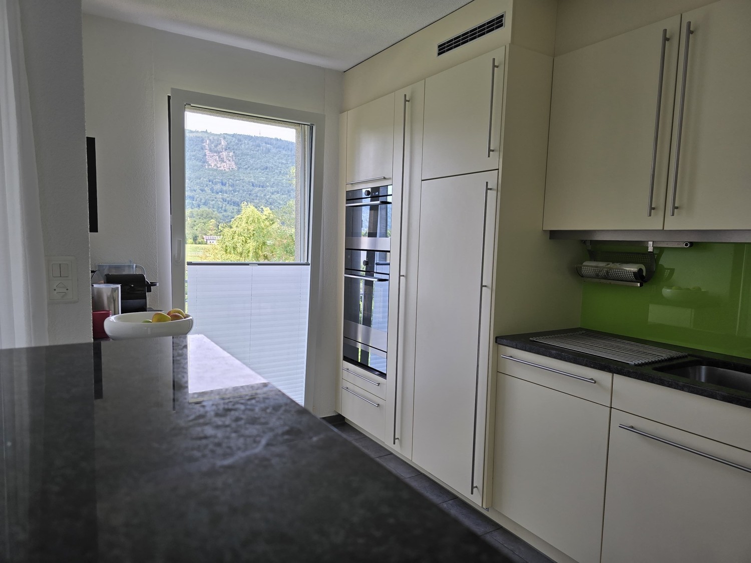 2 Terrassen: Die Grosse (14.5 m2) mit Abendsonne und Blick auf den Jura, die Kleine (10.5 m2) mit Morgensonne und «Big-Green-Egg-Grill»