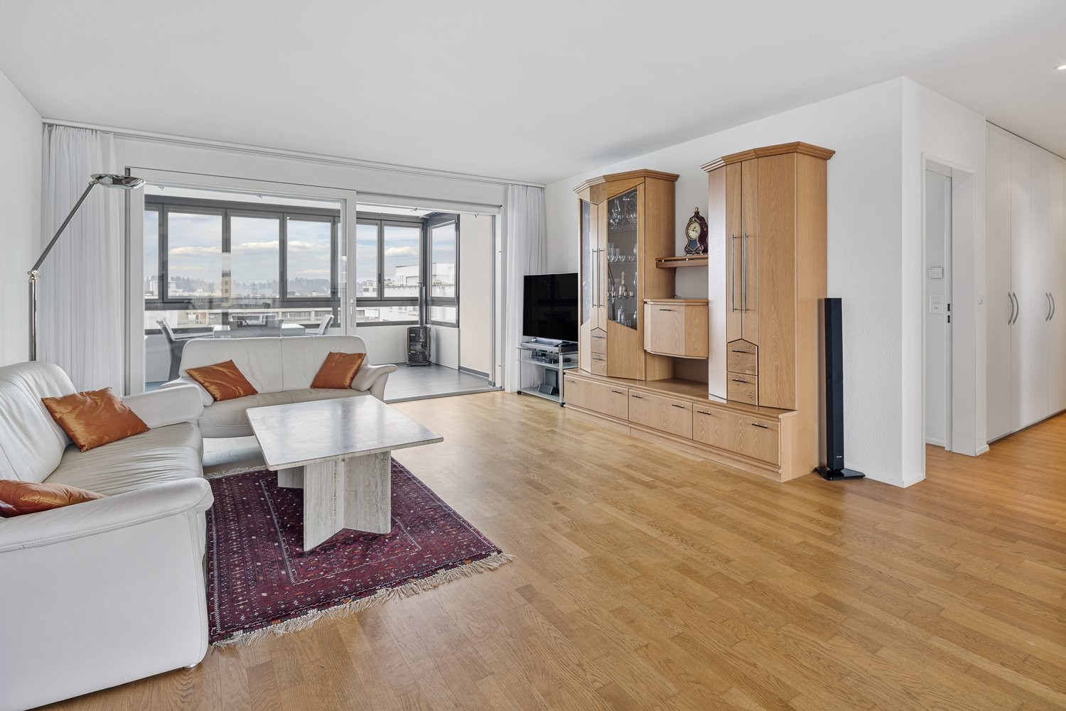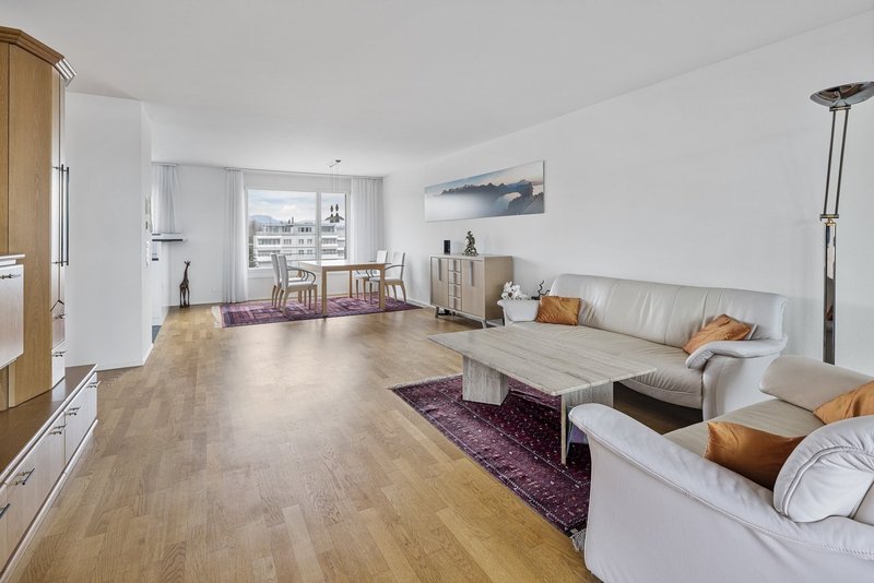 Beim Eintreten empfängt Sie ein grosszügiges Entrée mit praktischen Einbauschränken und einem geräumigen Reduit. Das separate Gäste-WC ist ideal platziert und unterstreicht den durchdachten Grundriss. Das Herzstück bildet unzweifelhaft der grosszügige Wohn- und Essbereich. Dank grossen Fenstern ist der Raum lichtdurchflutet und bietet herrliche Aussichten auf zwei Seiten. Der warme Parkettboden sorgt für eine wohnliche Atmosphäre. Direkt daran angegliedert ist der beheizte Wintergarten mit Süd-/West-Ausrichtung. Der Wintergarten lässt sich prima auch zum Essbereich, Lesezimmer, Büro oder Rückzugsort umfunktionieren.