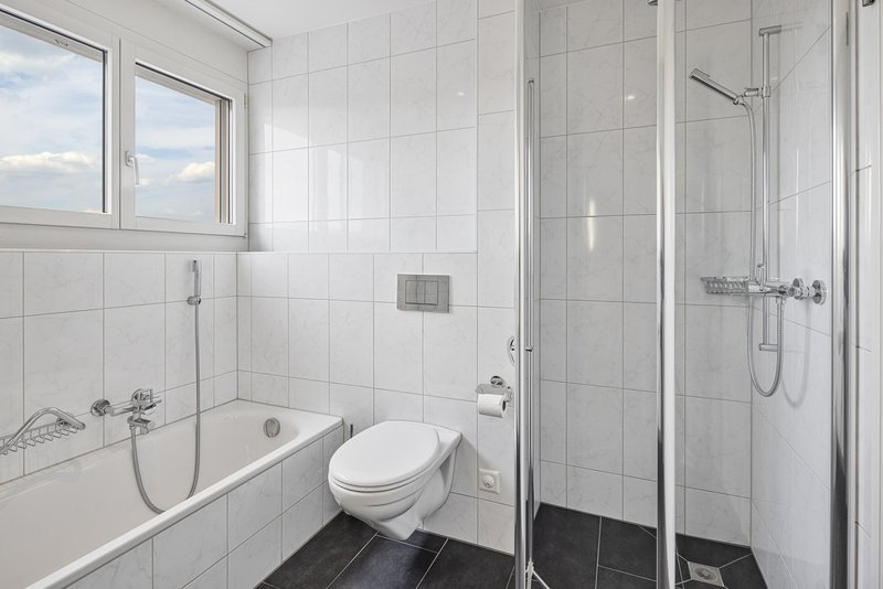- Nasszelle mit Badewanne, Dusche und Fenster