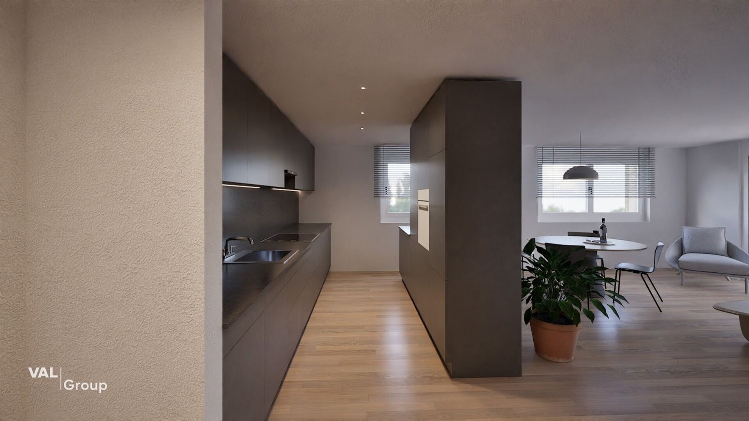 Das Herzstück der Wohnung bildet der grosszügige Wohn-, Ess- und Küchenbereich mit direktem Zugang zur weitläufigen Terrasse. Dank grossen Fensterflächen entsteht eine helle und freundliche Wohnatmosphäre. Die Terrasse bietet reichlich Platz zum Entspannen, für gesellige Abende oder zum Geniessen der umliegenden Berglandschaft.