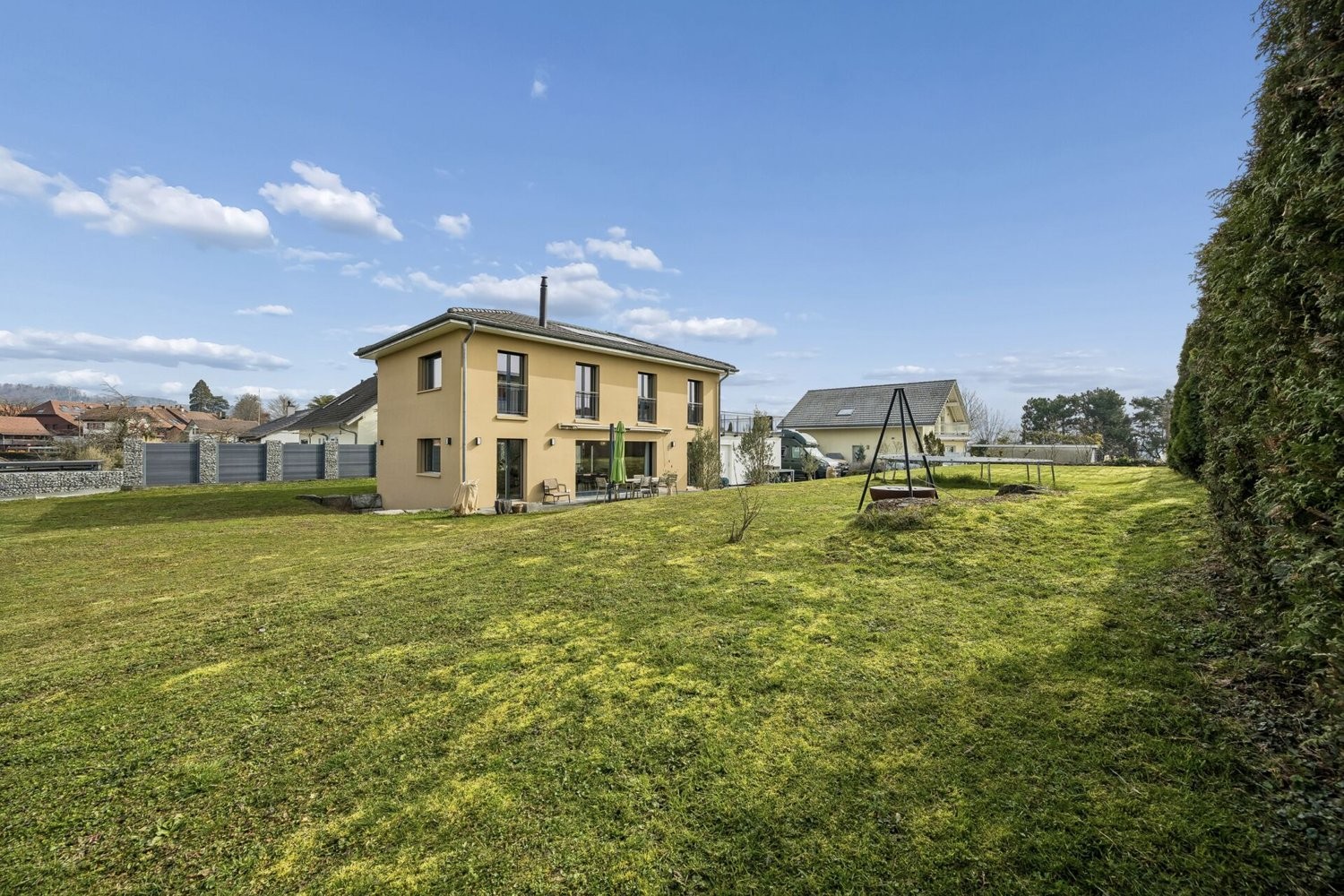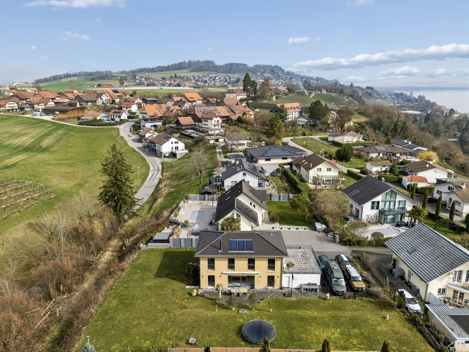 Cette maison individuelle moderne, construite en 2012, séduit par son architecture épurée, ses volumes généreux et sa situation privilégiée à proximité du lac de Morat. Implantée sur une vaste parcelle de 1'177 m², elle offre un cadre de vie alliant confort contemporain et proximité avec la nature. Sa position légèrement surélevée permet de profiter d'une belle vue sur le lac ainsi que d'un panorama dégagé sur les champs et les vignobles environnants, conférant à la propriété une qualité résidentielle particulière.