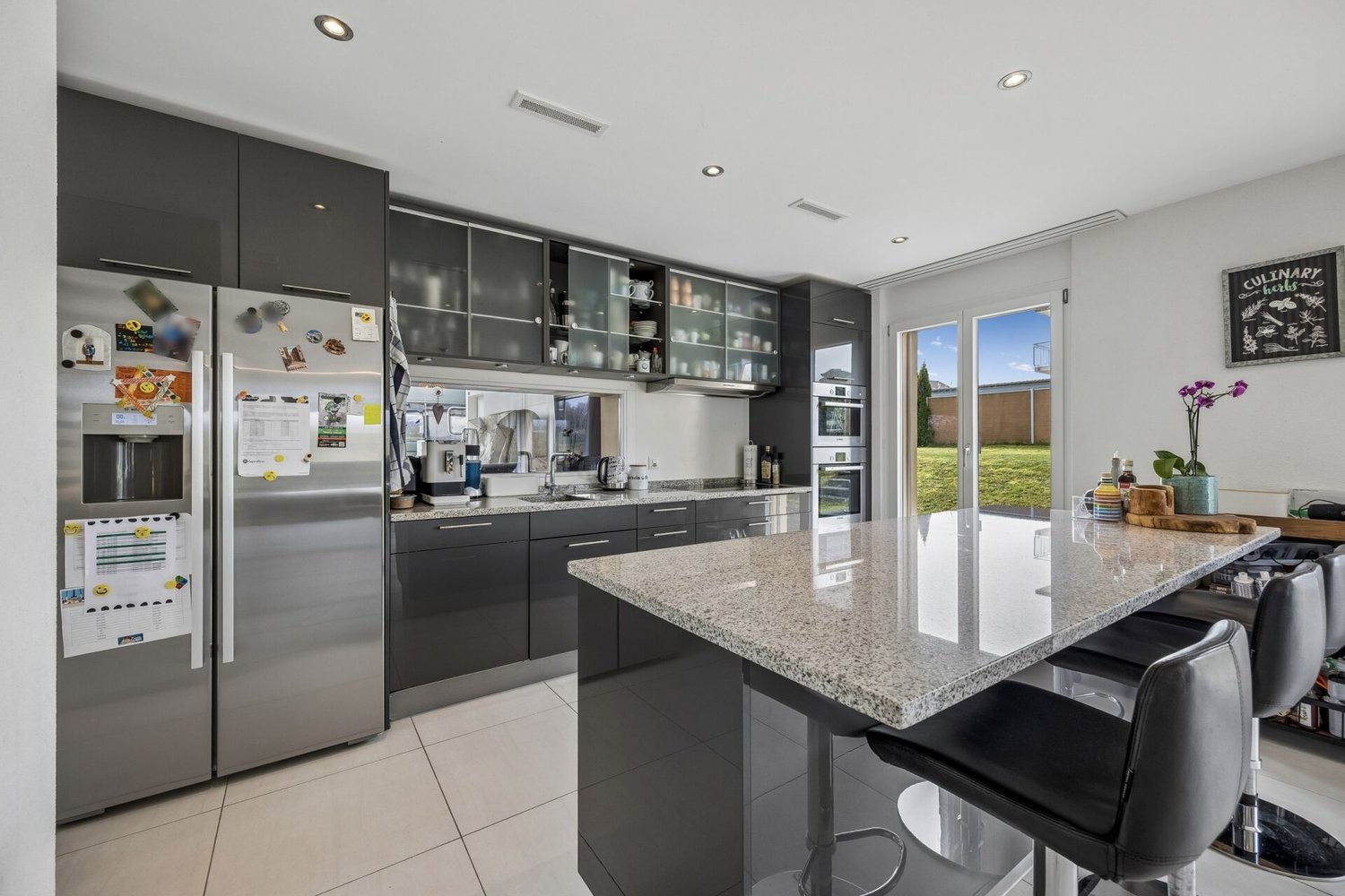 Bereits beim Eintreten empfängt Sie ein heller Eingangsbereich mit Garderobe und separater Gästetoilette. Das Erdgeschoss bildet mit seinem rund 56 m² grossen Wohn- und Essbereich das Herzstück des Hauses. Grosszügige Fensterflächen sorgen für viel Tageslicht und schaffen eine harmonische Verbindung zum Aussenraum. Die offene Küche mit Granitarbeitsfläche, hochwertigen Geräten und Kochinsel ist funktional gestaltet und fügt sich stilvoll in das Gesamtbild ein. Ein Schwedenofen setzt einen behaglichen Akzent und unterstreicht die wohnliche Atmosphäre.