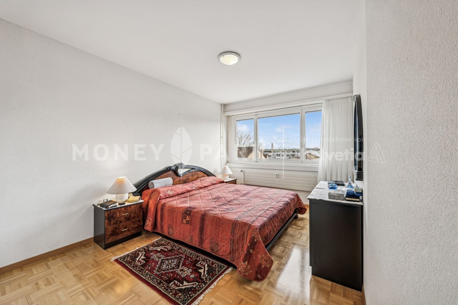Rechts vom Eingangsbereich führt ein Korridor zu den vier Zimmern, die ebenfalls mit dem hellen Holzparkett ausgestattet sind. Gegenüberliegend ist ein geräumiges Reduit sowie ein separates WC mit Lavabo und eigener Waschmaschine. Eine Türe weiter liegt das Badezimmer mit Eckbadewanne.