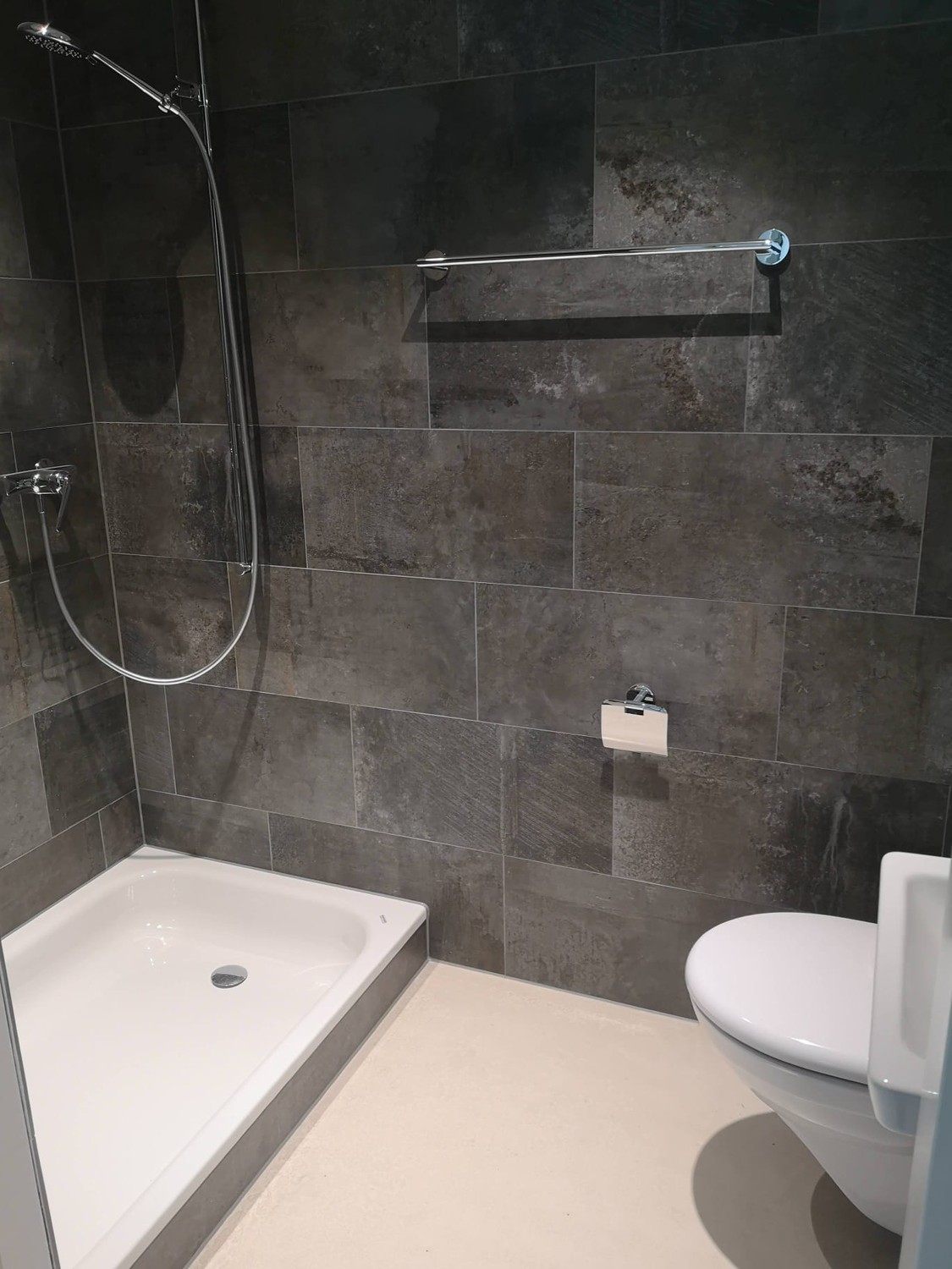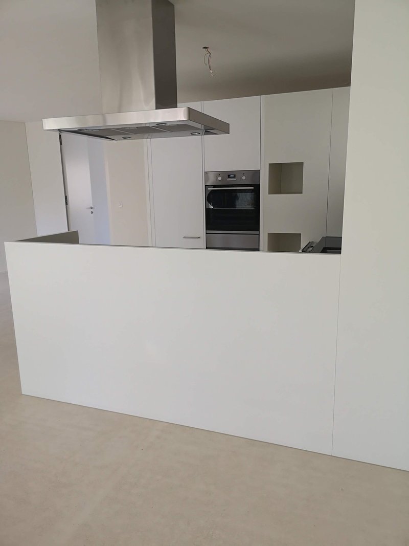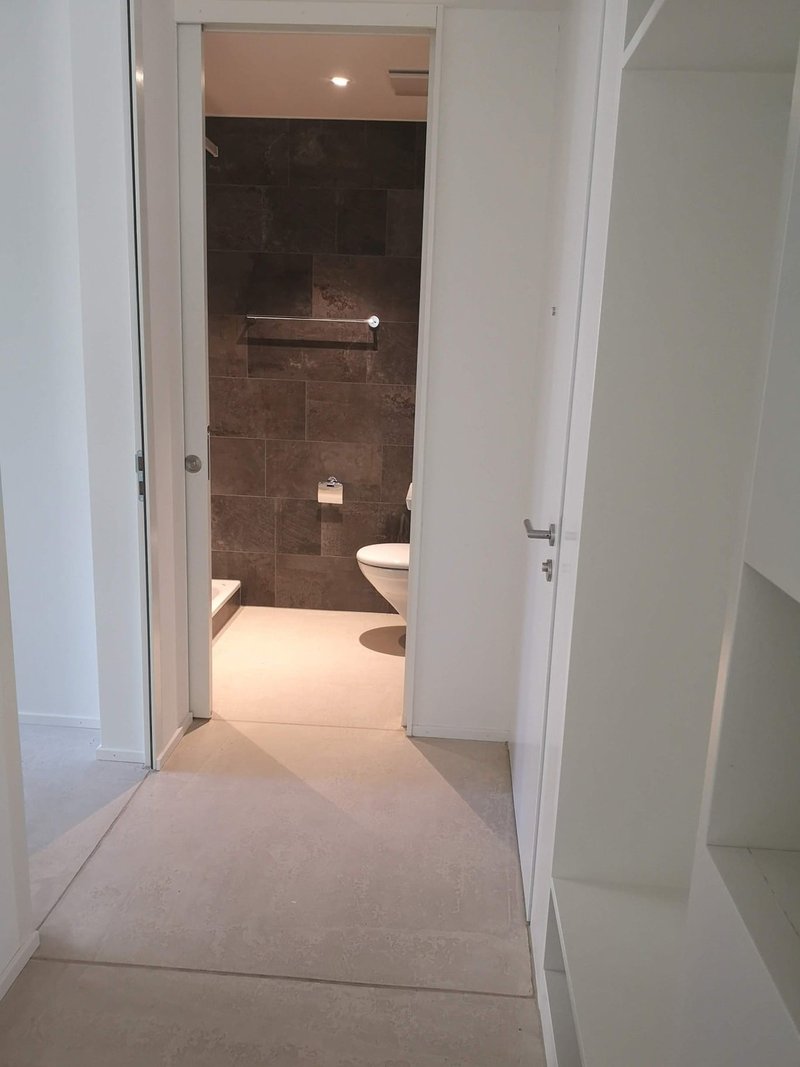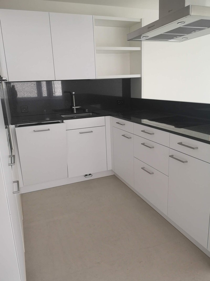 Küche & Bad: Moderne, offene Küche in Weiss mit dunkler Natursteinabdeckung (Granit), Induktionsherd und NoFrost-Gefrierabteil. Die Wohnung verfügt über ein En-Suite-Badezimmer sowie ein separates Gäste-WC mit Dusche.