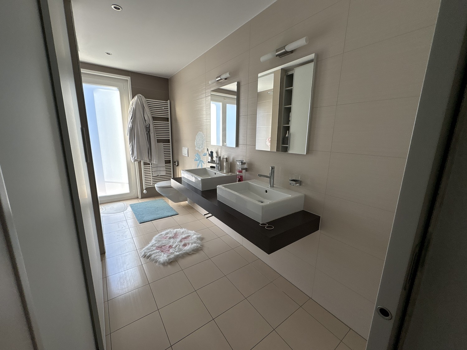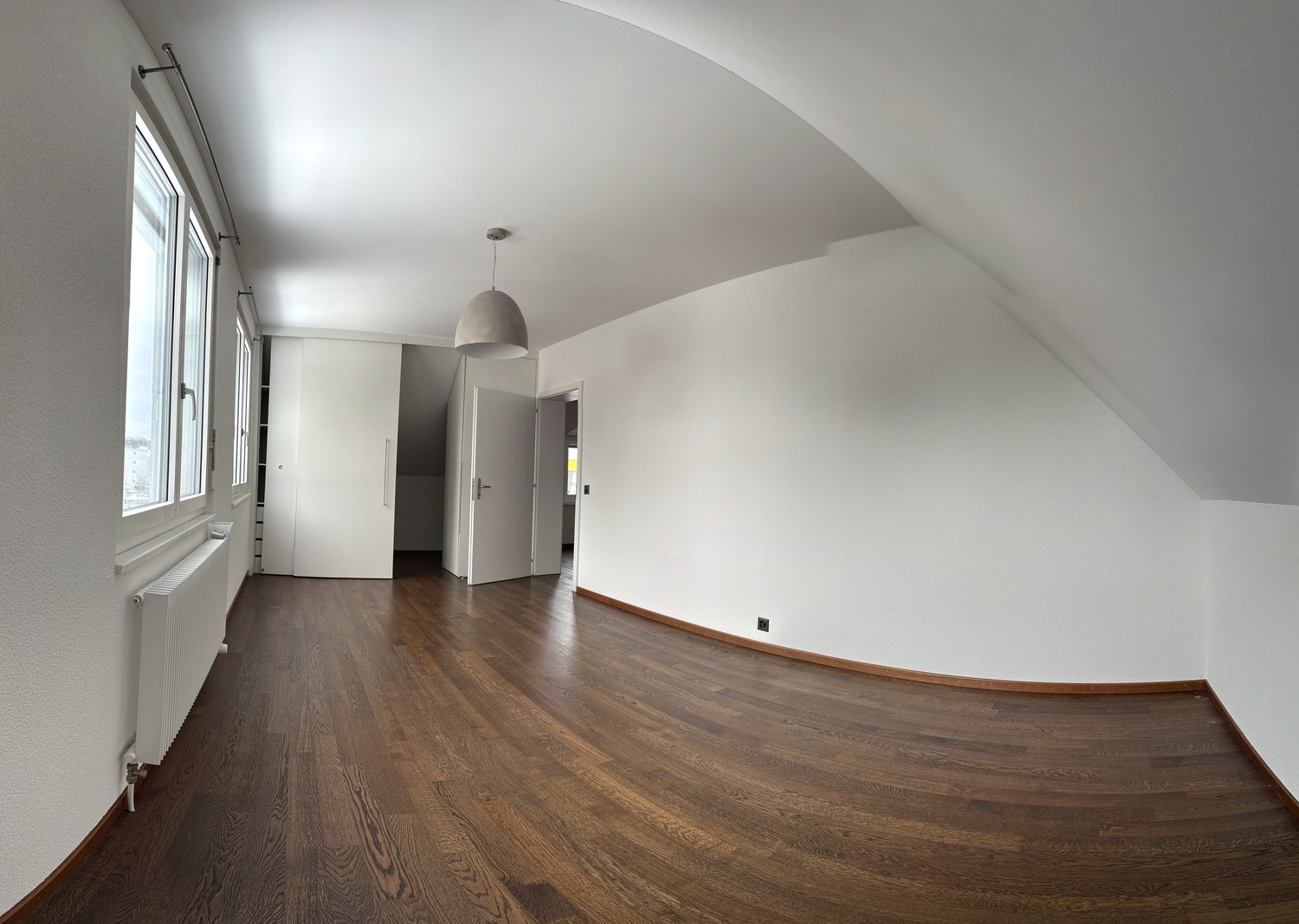 Der Zugang erfolgt entlang der Doppelgarage zum einladenden Eingangsbereich. Im Erdgeschoss befinden sich ein Gästezimmer mit eigener Nasszelle, ein grosszügiger Empfangsbereich mit repräsentativer Treppe sowie eine hochwertige Küche. Der Wohnbereich mit Cheminée ist von zwei Seiten zugänglich und bietet einen schönen Blick über die Veranda in den dreiecksförmigen Garten.