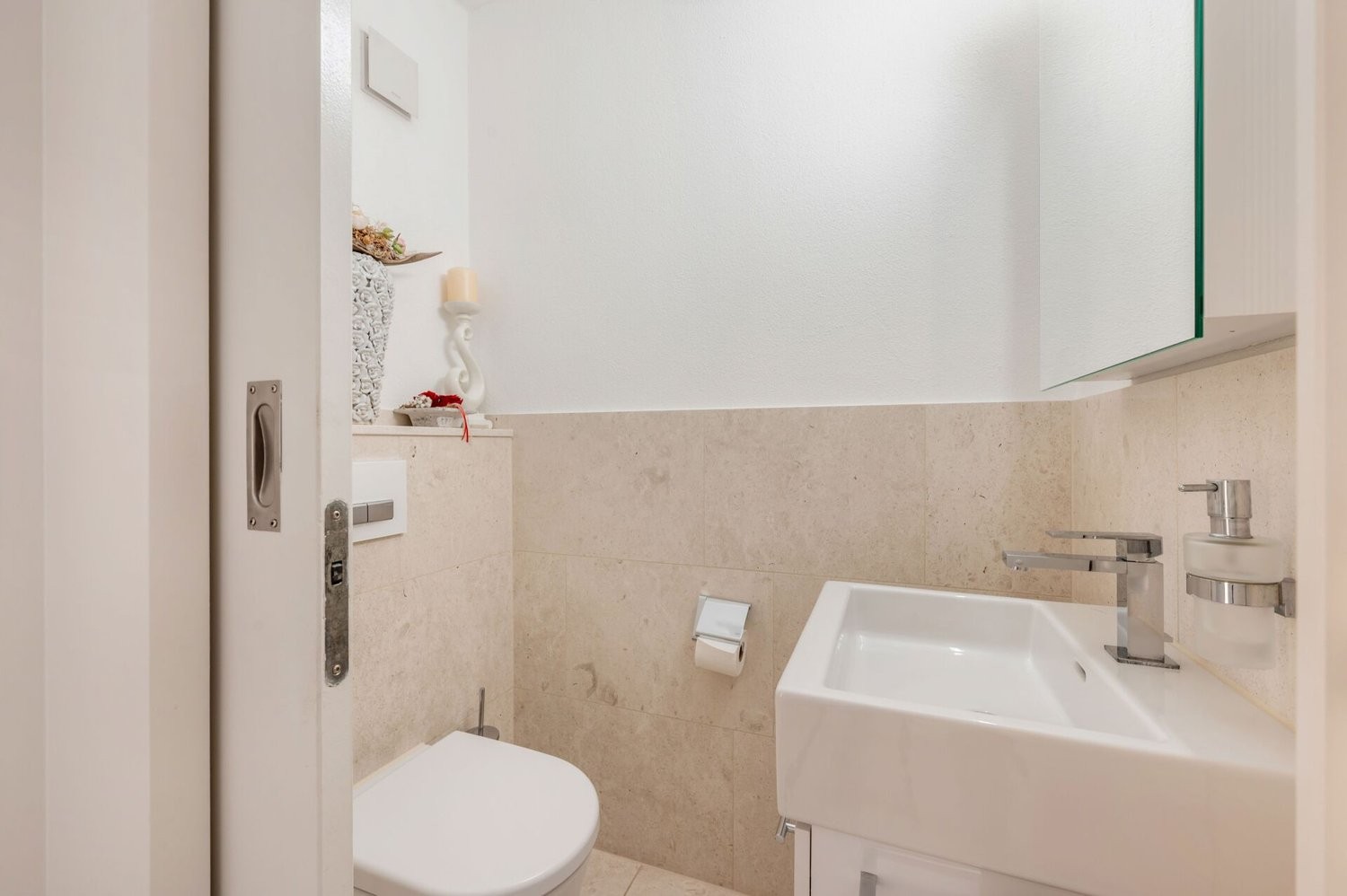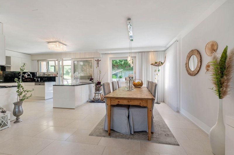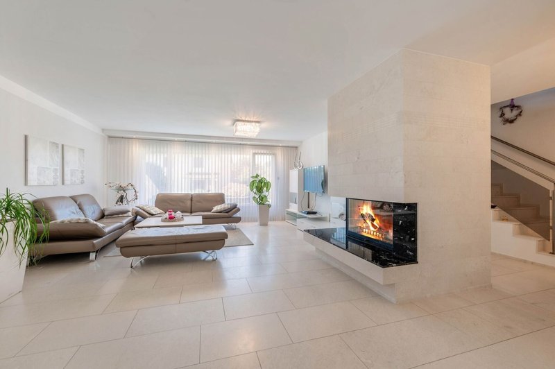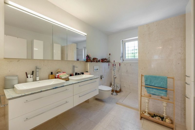 Das Haus und der Garten bieten viel Privatsphäre, einen klar strukturierten Grundriss auf zwei Etagen mit einer Wohnfläche von 153 m². Im Erdgeschoss erwartet Sie ein grosszügiger Eingangsbereich mit Platz für Ihre Garderobe. Der einladende Wohn- und Essbereich grenzt direkt an die offene Wohnküche mit viel Stauraum, diversen Arbeitsflächen und moderner Theke. Im Sommer lässt sich das Leben vom Wohnbereich in den Aussenbereich verlegen, mit wunderbarem Sitzplatz im Grünen und gedeckter Terrasse mit Cheminée. Im Winter sorgt das weitere Cheminée im Wohnbereich für gemütliche Abendstunden. Des Weiteren findet sich im Erdgeschoss ein grosser Vorratsraum, der Luftschutzkeller sowie die Waschküche mit Aussenzugang und Sportlerdusche. Eine Gästetoilette mit Lavabo rundet das Raumangebot ab.