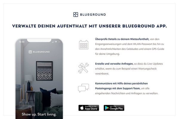 Während Ihres Aufenthalts haben Sie über die Blueground-App Zugriff auf unser Customer Experience-Team. Sie können zusätzliche Reinigungsarbeiten planen, Wartungsanfragen einreichen und unsere Nachbarschaftempfehlungen mit nur wenigen Fingertipps anzeigen.