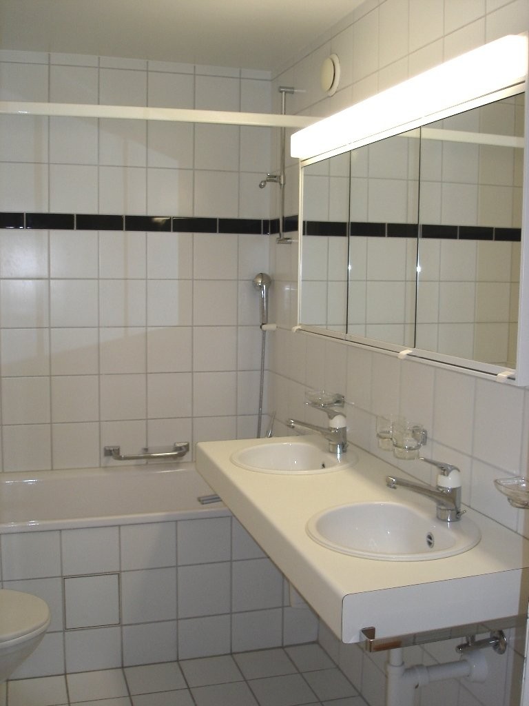 - hell gehaltenes Bad/WC mit Doppellavabo , ohne Fenster, Waschmaschinenanschluss vorhanden, keramische Bodenplatten