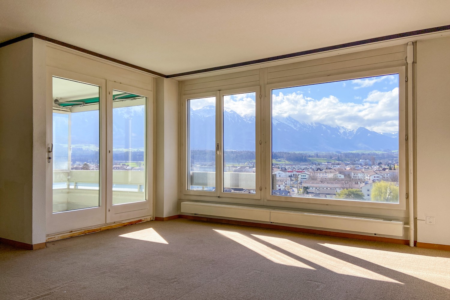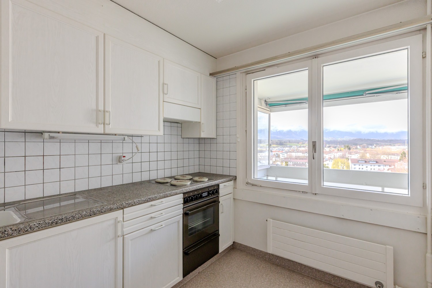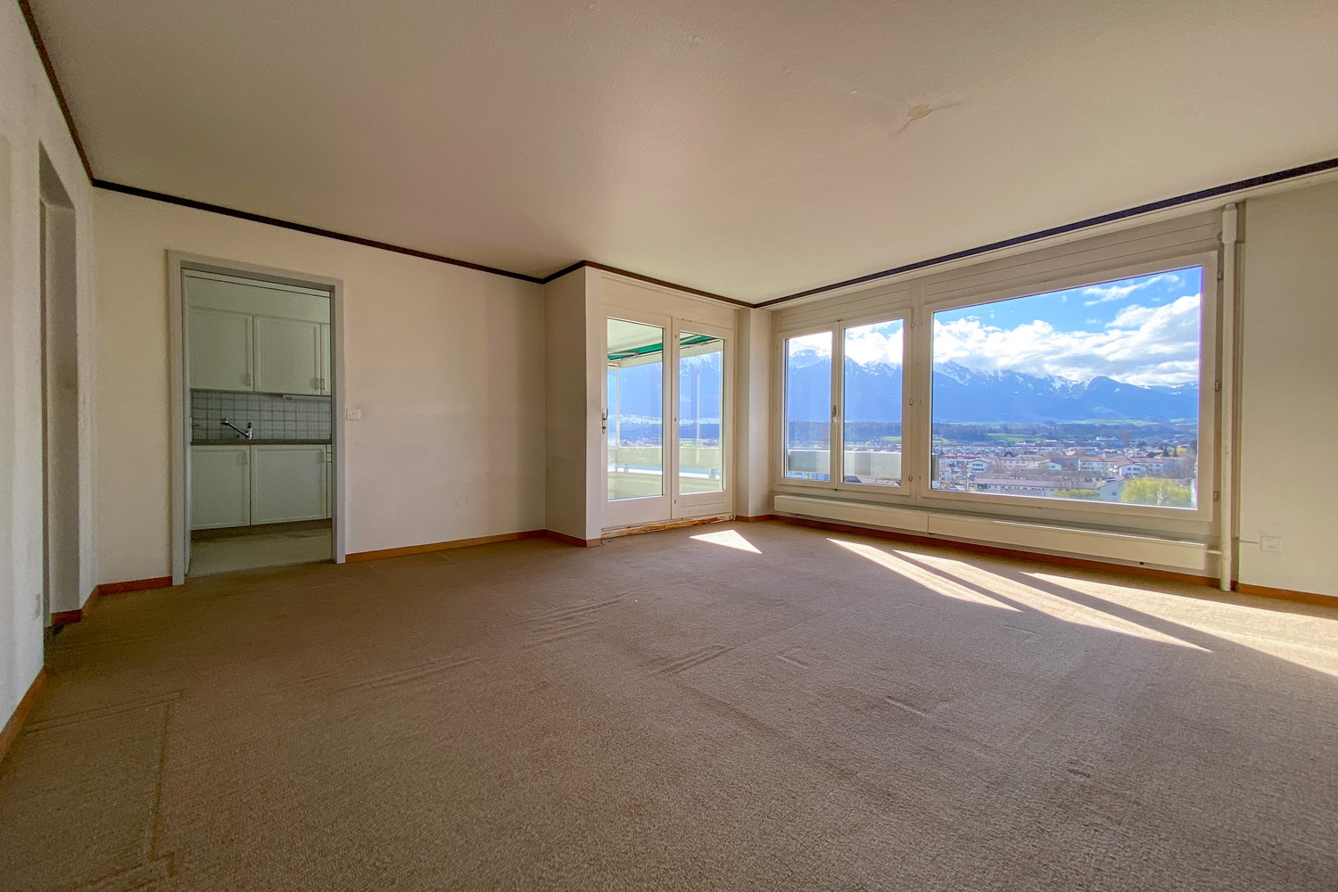 Der Wohn- und Essbereich präsentiert sich hell und einladend und bildet das Herzstück der Wohnung. Grosse Fensterflächen sorgen für viel Tageslicht und unterstreichen das offene, freundliche Wohngefühl. Von hier aus eröffnet sich eine schöne Weitsicht über die Dächer der Umgebung und die umliegende Landschaft. Die angrenzende Küche bietet ausreichend Arbeits- und Stauraum und ermöglicht eine praktische Nutzung im Alltag.