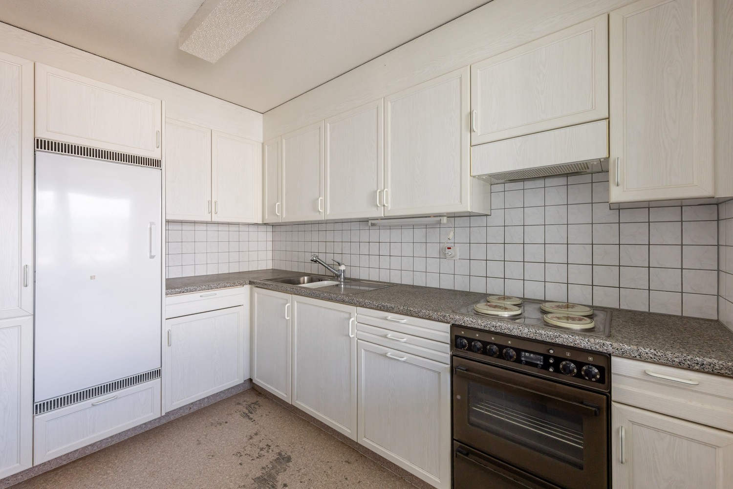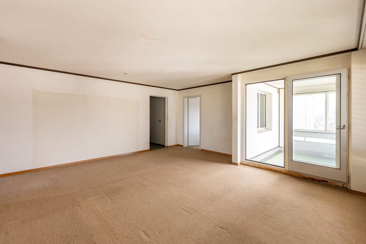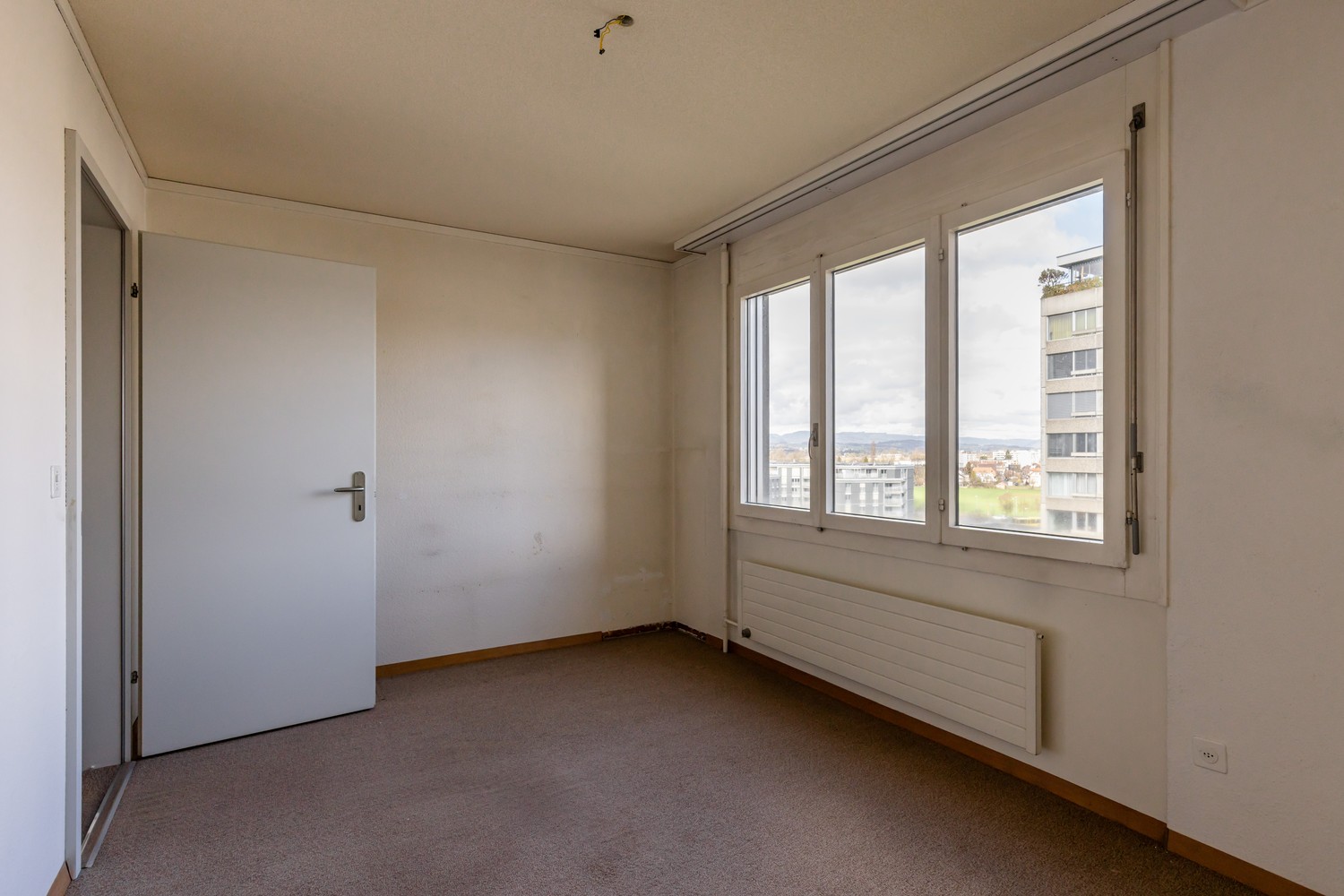 Der Wohn- und Essbereich präsentiert sich hell und einladend und bildet das Herzstück der Wohnung. Grosse Fensterflächen sorgen für viel Tageslicht und unterstreichen das offene, freundliche Wohngefühl. Von hier aus eröffnet sich eine schöne Weitsicht über die Dächer der Umgebung und die umliegende Landschaft. Die angrenzende Küche bietet ausreichend Arbeits- und Stauraum und ermöglicht eine praktische Nutzung im Alltag.