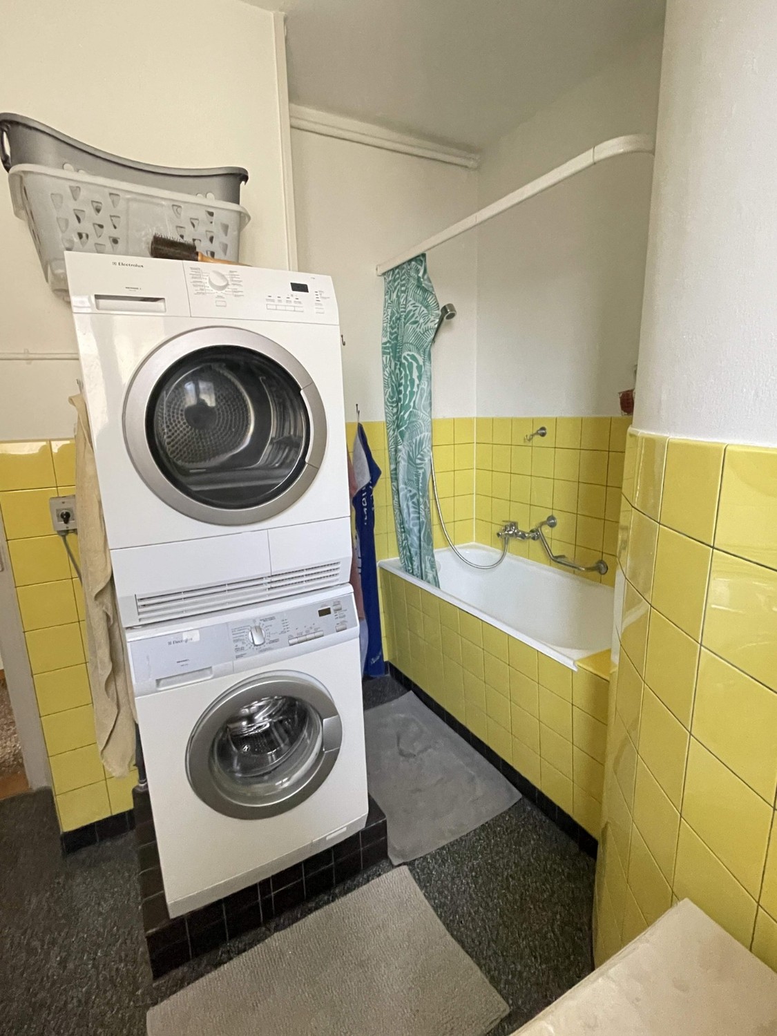 · 2 Badezimmer: Mit Einbauschränken, Badezimmer in freudiger, gelber Farbe mit tiefer Badewanne und Waschmaschine und Tumbler und Badezimmer mit Dusche