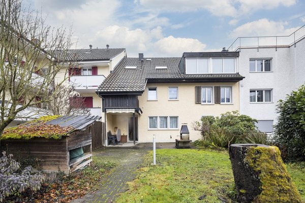 Die 2.5-Zimmerwohnung im Erdgeschoss verfügt über einen eigenen Hauseingang und ist vermietet. Vor dem Hauseingang wartet ein kleiner, einladender Sitzplatz, der zu dieser Wohneinheit gehört. Von der Wohnung aus gelangen die Bewohner zudem direkt in die Waschküche, die mit den anderen Parteien geteilt wird.