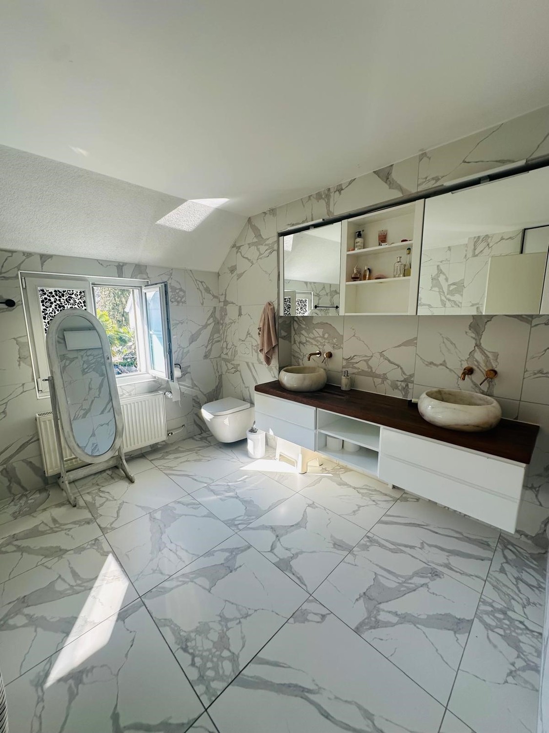 Im 1. Obergeschoss befindet sich das helle und grosszügige Badezimmer mit zwei Lavabos in Natursteinoptik und einer freistehenden Badewanne. Auf dieser Etage befinden sich drei grosse Schlafzimmer, wovon eines über einen integrierten begehbaren Kleiderschrank verfügt.
