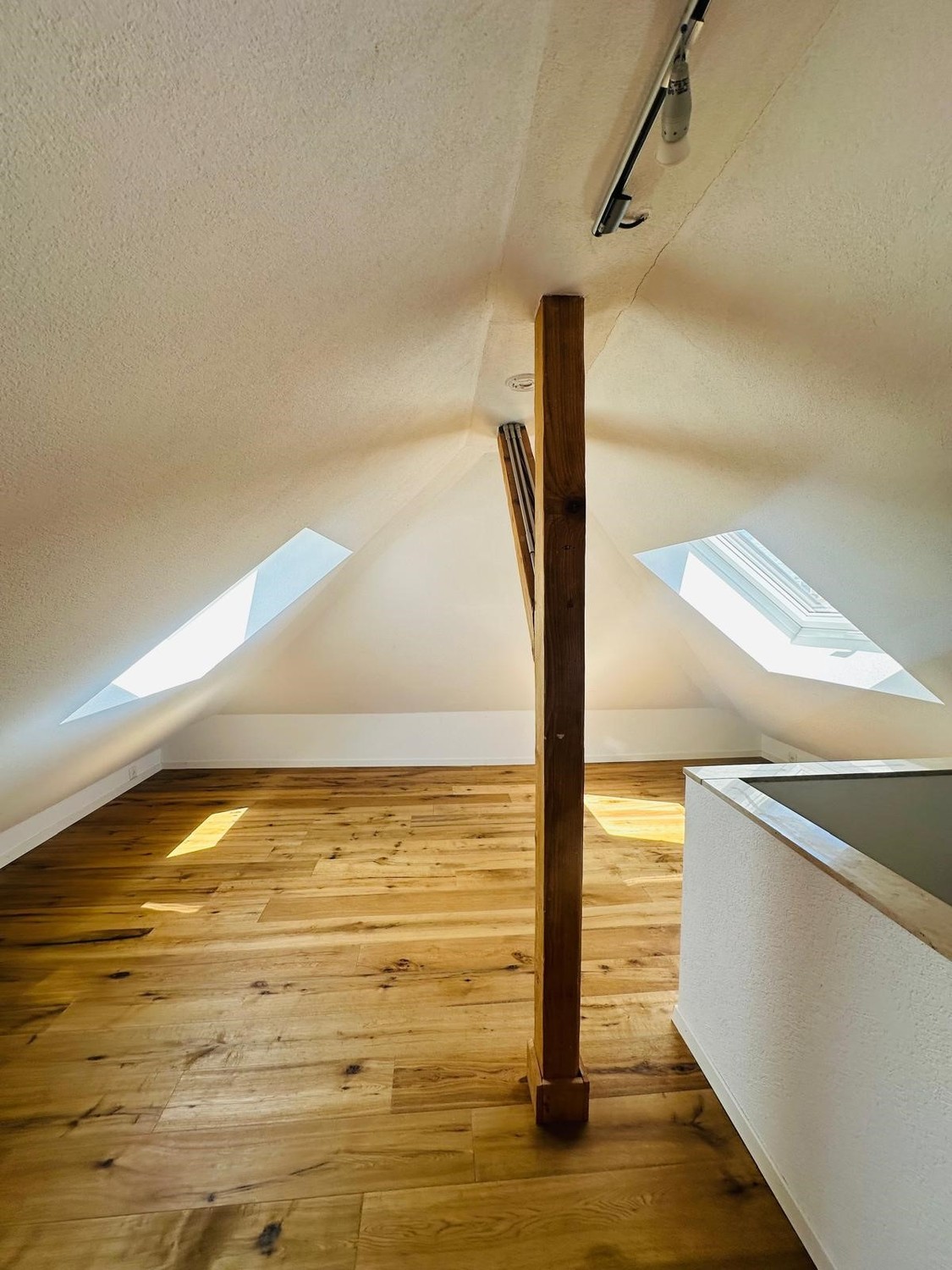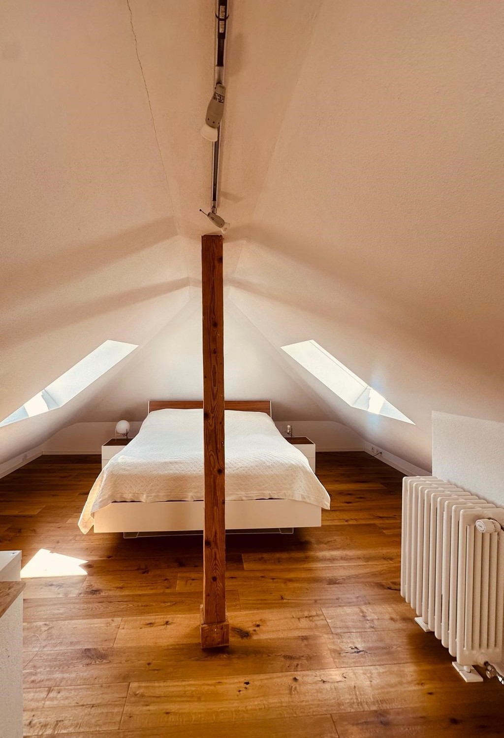 Im ausgebauten Dachgeschoss unterstreichen die sichtbaren Holzbalken den Charme des Gebäudes. Hier ist Platz für eine individuelle Nutzung möglich, wie zum Beispiel ein weiteres Schlafzimmer oder wahlweise ein Gäste-/Arbeitszimmer.