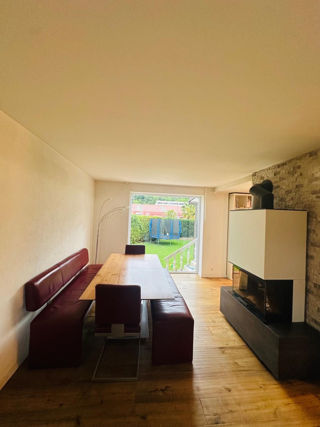 Vom Eingangsbereich aus gelangt man zu dem als Schlafzimmer ausgebauten Garagen mit separatem Bad mit Dusche und WC-Anlage. Im Hochparterre, welches durchgehend mit robustem Parkettboden ausgestattet ist, befindet sich der offene und geräumige Wohnbereich. Hier ist auch der Schwedenofen für gemütliche Abende verbaut und über das grosse, nach Westen zum grosszügigen Garten ausgerichtete, bodentiefe Panoramafenster strahlt die Morgensonne herein und verschafft ein angenehmes Ambiente. Die offene, hochwertige Küche mit hellem Granitstein und V-Zug Geräten verfügt über angenehme Details wie einen hochliegenden Backofen, ein Induktionskochfeld und viel Stauraum.
