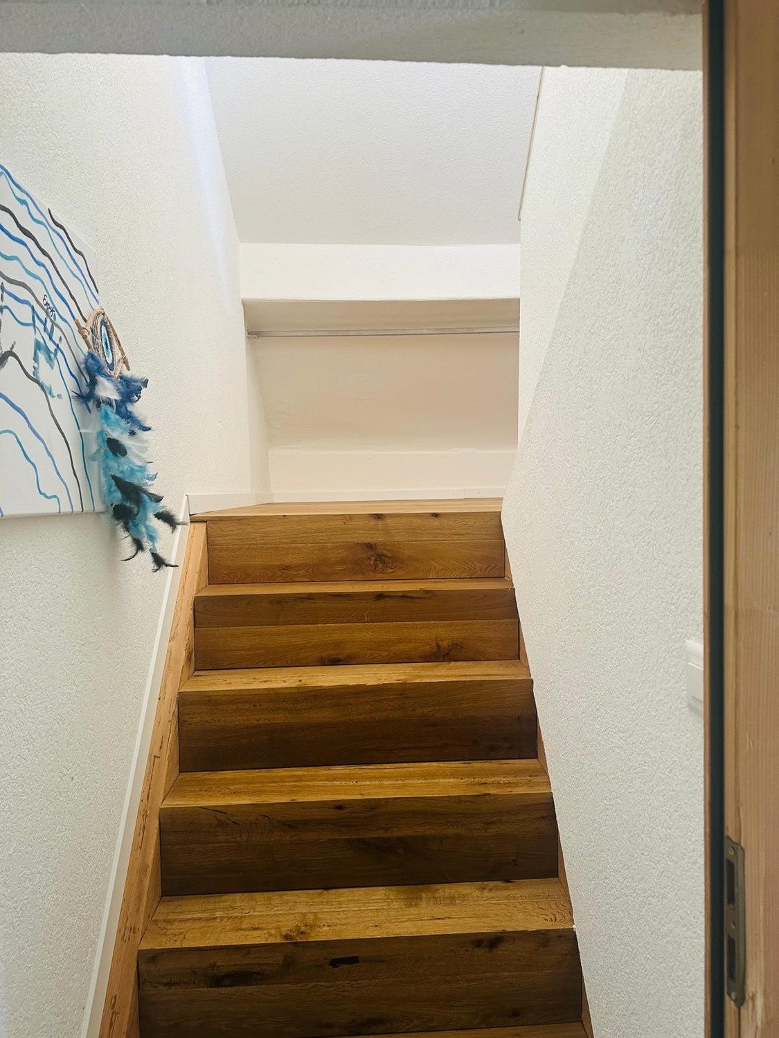 Über die innenliegende Treppe gelangt man zur Zwischenetage, wo sich ein Tageslicht-Bad mit WC und Regendusche befindet.