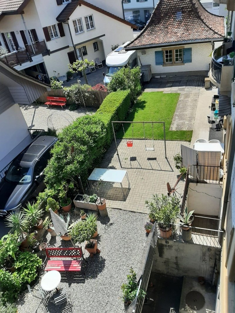 Aussenbereich: Zwei kleine Balkone sowie ein traumhafter Gemeinschaftsgarten, der eine grüne Oase im Dorfzentrum bietet.