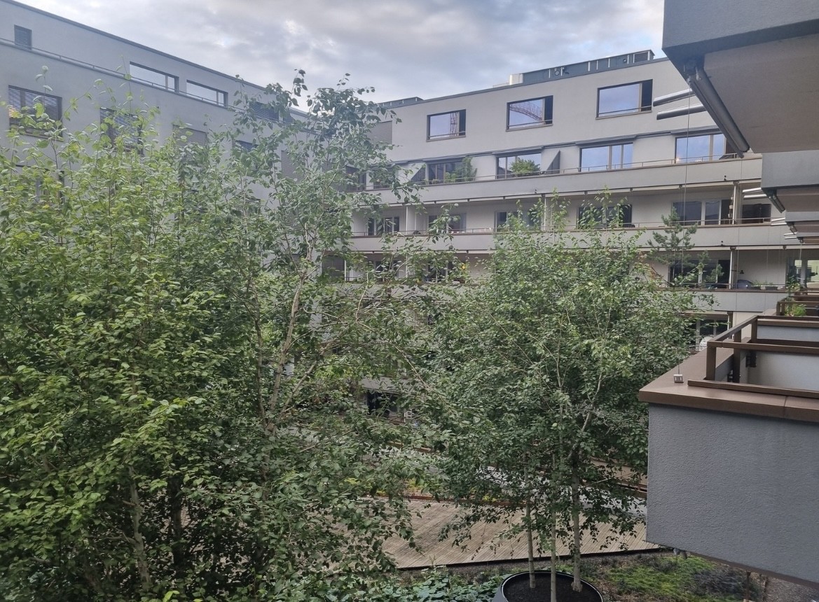 sonniger Balkon mit Blick in den ruhigen Innenhof