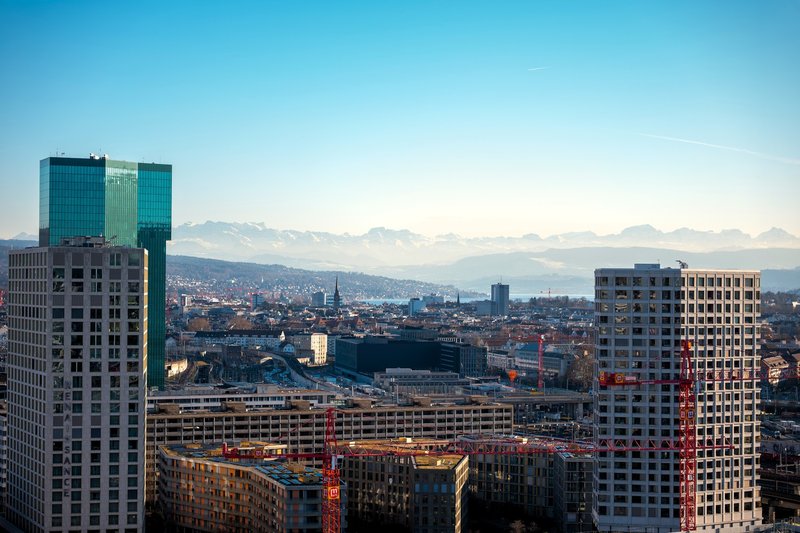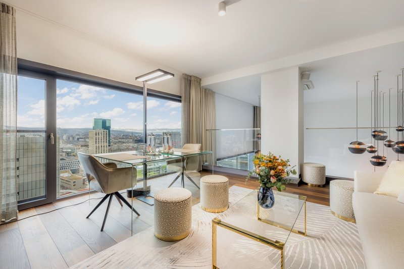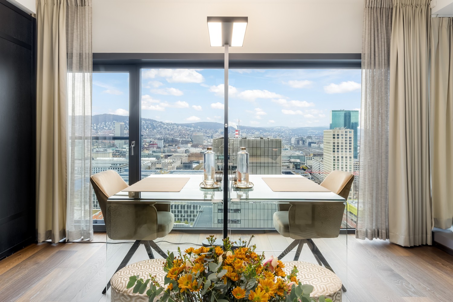 Der offene Grundriss mit Loft-Charakter, raumhohen Fenstern, 5.40 m Deckenhöhe und einem eindrucksvollen Panoramablick über die Stadt Zürich, den Zürichsee und die Alpen schafft eine Atmosphäre, die sowohl bei Kundenterminen als auch bei internen Meetings Eindruck macht. Trotz der grosszügigen Fensterflächen bietet das Penthouse ein hohes Mass an Privatsphäre.