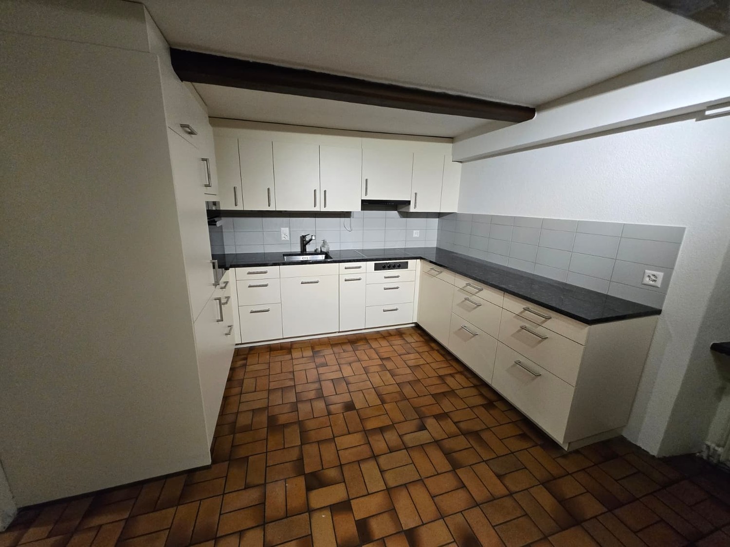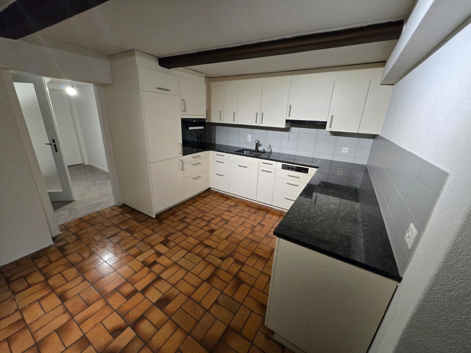 Moderne Küche: Hochwertige, weisse Einbauküche im Erdgeschoss mit grosszügiger dunkler Arbeitsfläche und modernen Markengeräten.