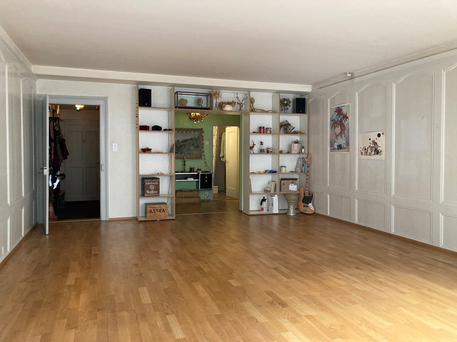 Heller Wohnraum mit schönem Parkettboden und grossen Fenstern