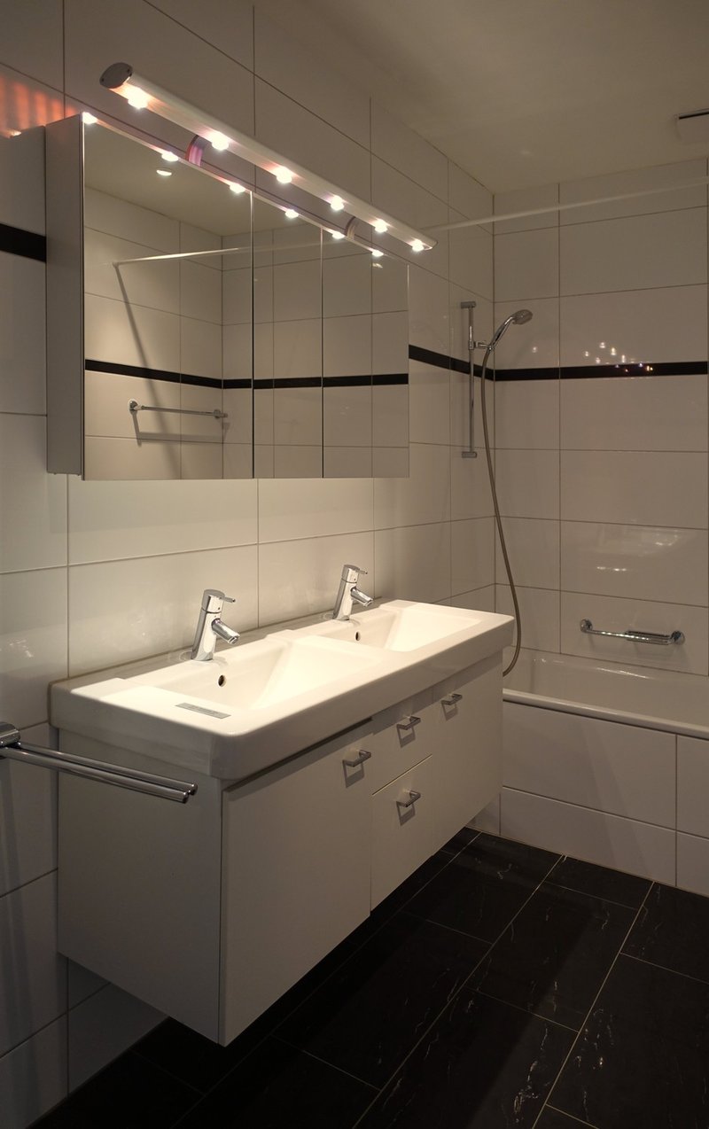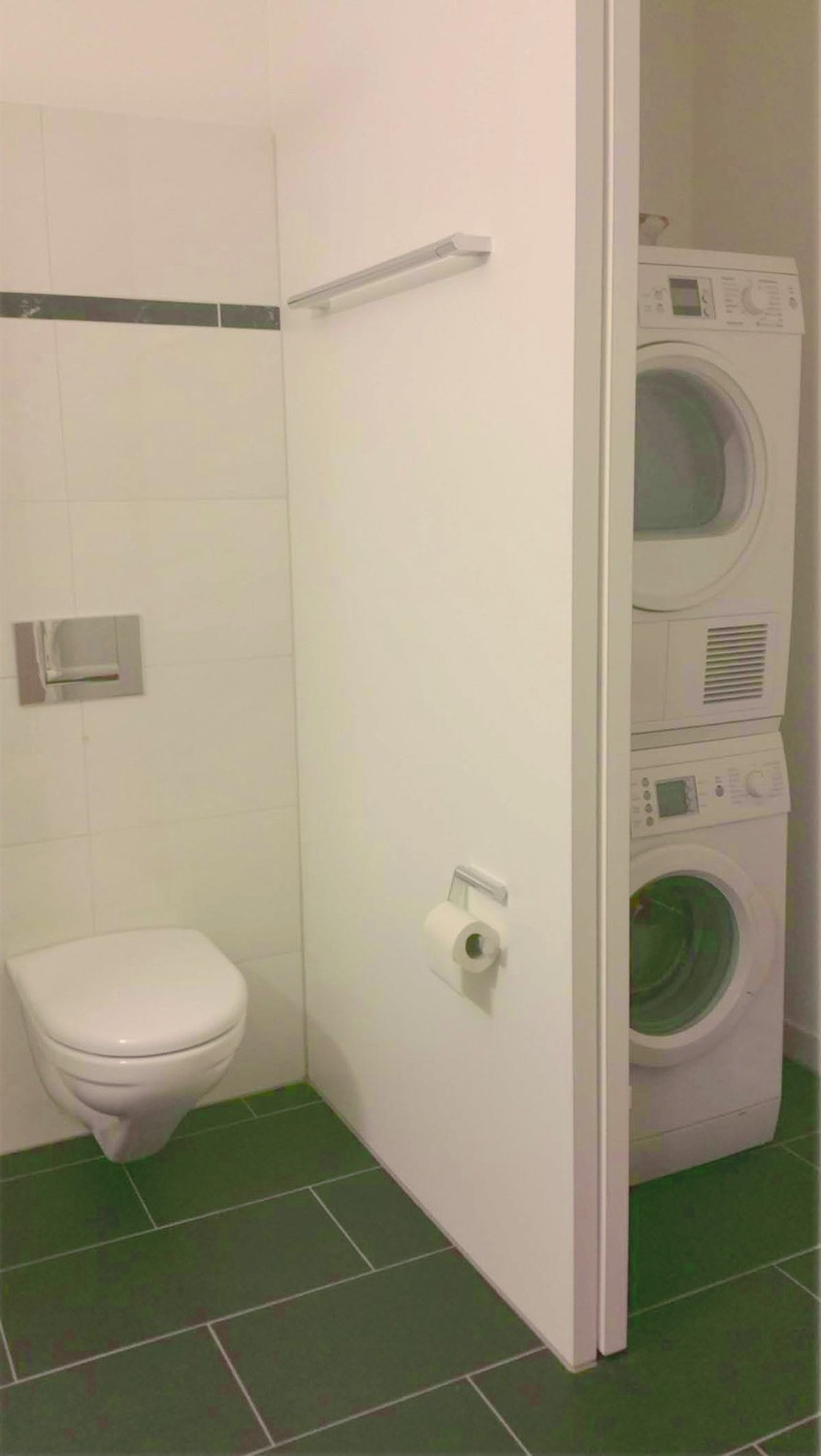 Waschen: Waschmaschine und Tumbler in Dusche integriert