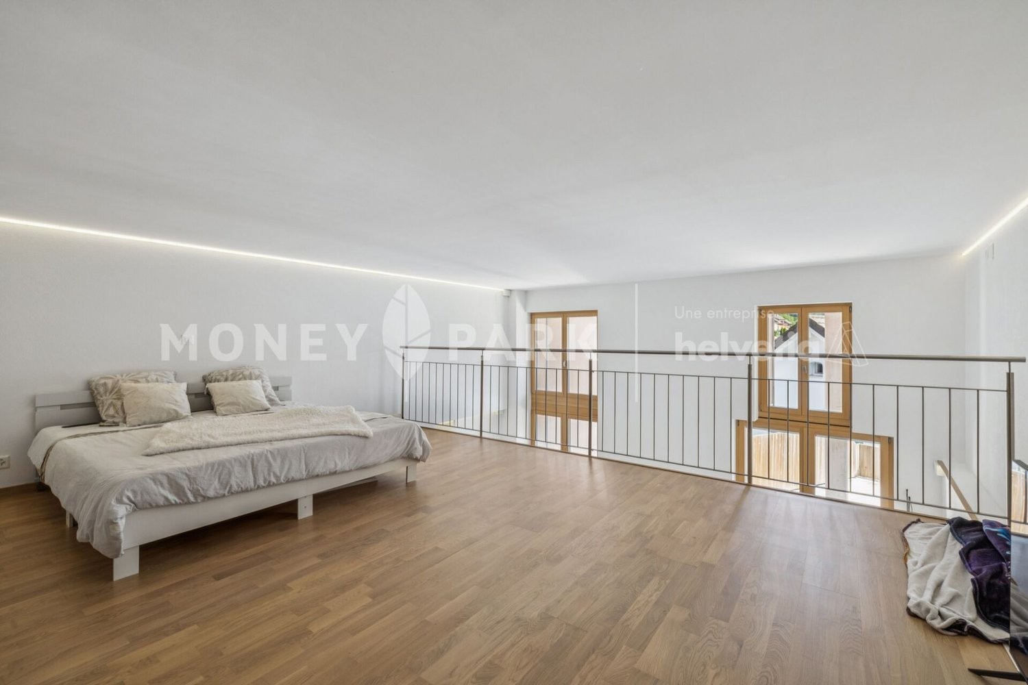 La partie supérieure propose une grande chambre ouverte sur le rez-de-chaussée, une salle de douche ainsi qu'un espace dressing.