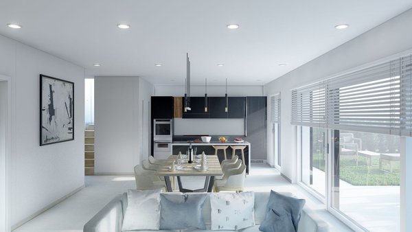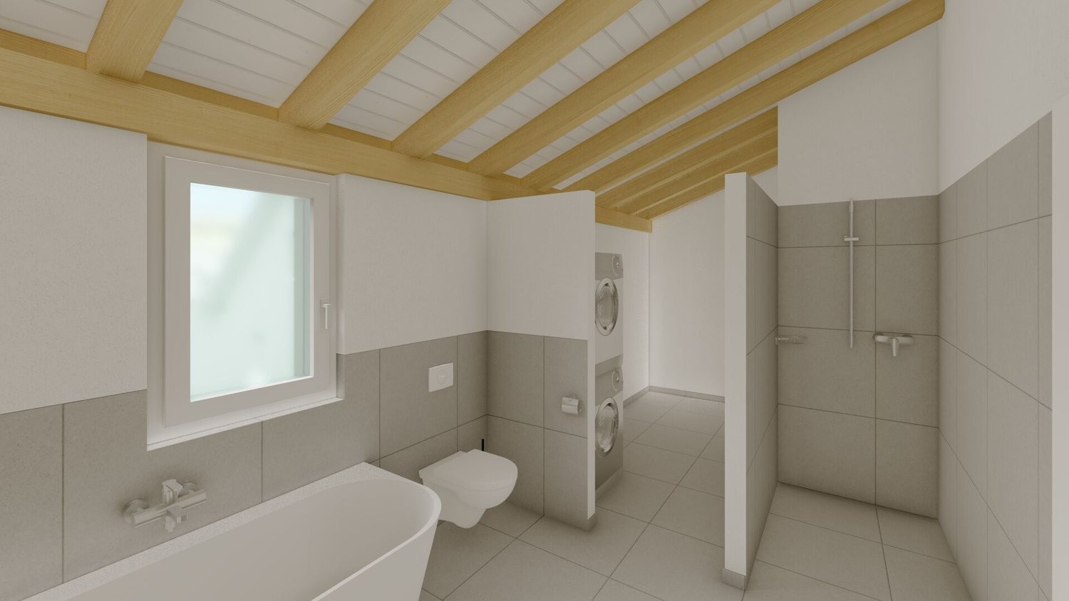Erdgeschoss: Eingangsbereich mit Garderobe, Duschbad, Technikraum, Büro sowie offene Küche mit grosszügigem Wohn-/Essbereich und Zugang zum Garten. Ein Abstellraum (ca. 20?m²) ist von aussen zugänglich.