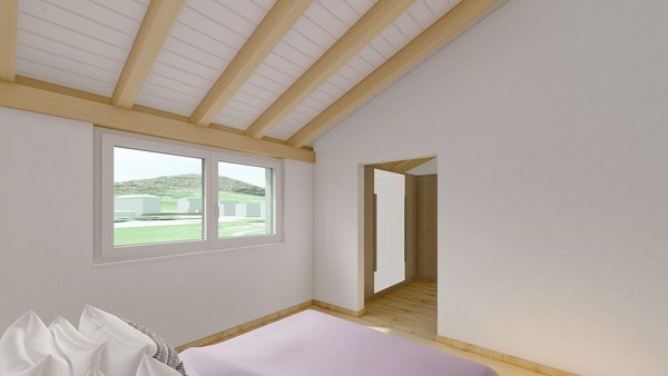 Obergeschoss: Bad mit Waschbereich, grosses Elternschlafzimmer mit Ankleide sowie zwei weitere Schlafzimmer.