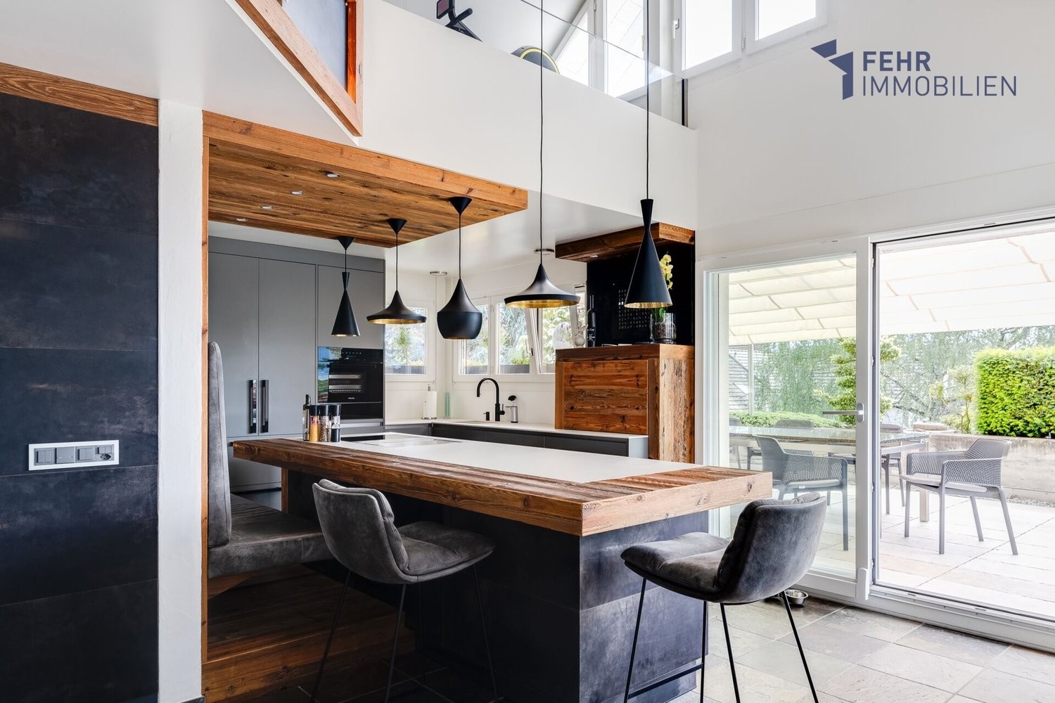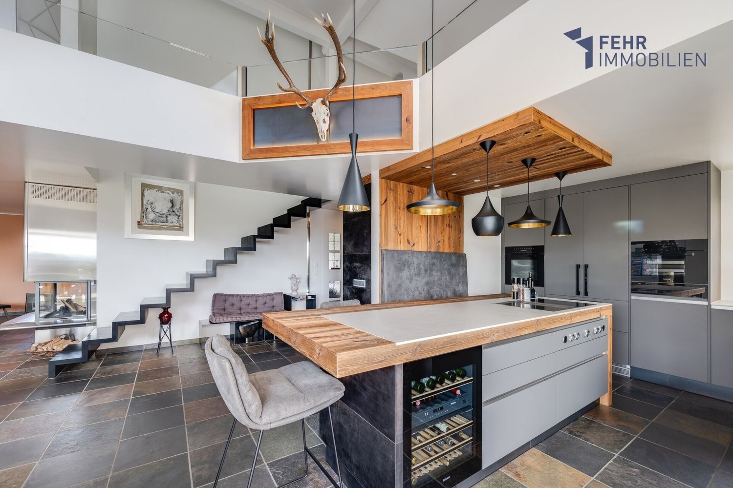 Die exklusive, elegante Küche (2020) ist mit hochwertigen Küchengeräten der Marke Miele ausgestattet und bietet Zugang zur Terrasse. Sie verfügt u.a. über einen Side by Side Kühlschrank Liebherr (Foodcenter), Induktionsherd Bora, Teppanyaki, Bora-Dampfabzug, Backofen, Steamer und Wärmeschublade auf Arbeitshöhe sowie einen Weinschrank. Die stilvolle, hochwertige Sitzbank an der Kochinsel mit dekorativen Massivholzelementen lädt dazu ein, dem Kochgeschehen zuzusehen und zu entspannen.