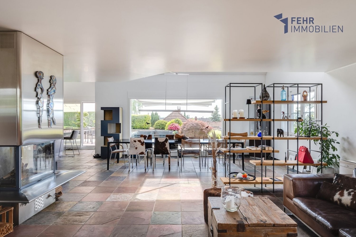 Grossflächige Fensterfronten erfüllen den Wohn-/Essbereich mit viel Licht und Helligkeit. Ein modernes, verglastes Cheminée lädt im Wohnbereich zum gemütlichen Beisammensitzen ein und unterstreicht den stilvollen Luxus und die Behaglichkeit dieser einzigartigen Wohnung.