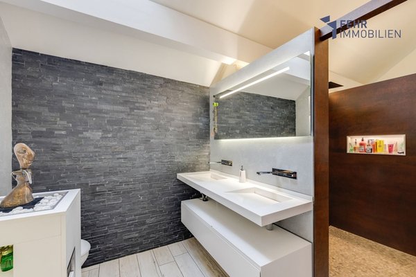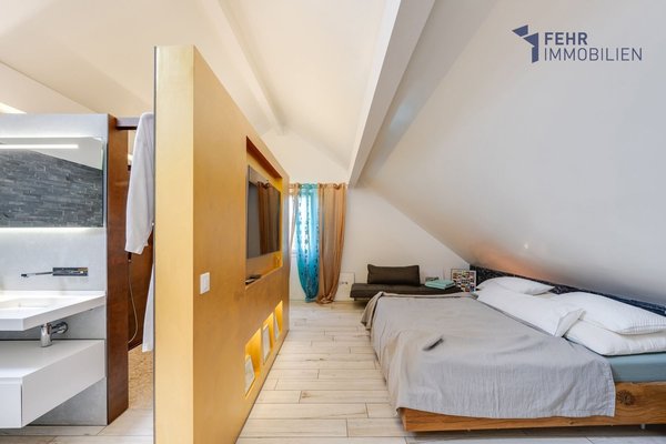 Von der Galerie erreichen Sie ein weiteres Zimmer, welches über ein exklusives Highlight, einem Ensuite-Bad, eingebaut in einem goldenen Kubus, verfügt. Darin sind eine grosse italienische Dusche mit Flusssteinboden, ein Doppellavabo, ein WC und Einbauschränke enthalten. Der Kubus dient gleichzeitig als Raumtrenner von Schlaf- und Ankleideraum. Der geräumige Ankleideraum wiederum begeistert mit zahlreichen Tablaren und viel Stauraum.