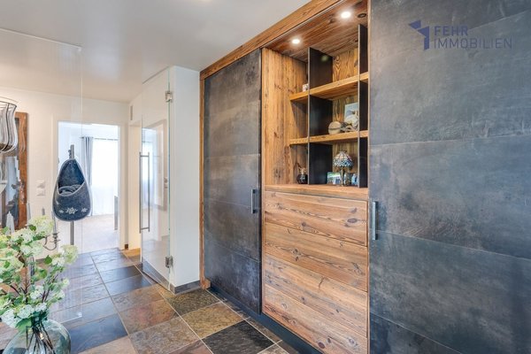 Im Eingangsbereich empfängt Sie eine Garderobe mit Einbauschränken und führt Sie weiter in den lichterfüllten Wohn-/Essbereich mit offener Küche.