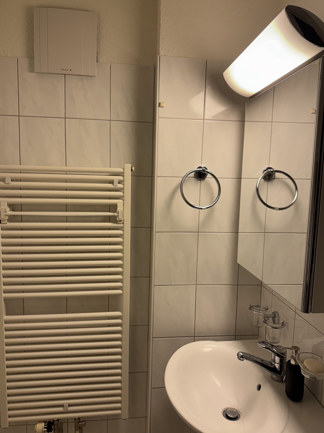 Badezimmer: Helles Bad mit Badewanne und Handtuchradiator.