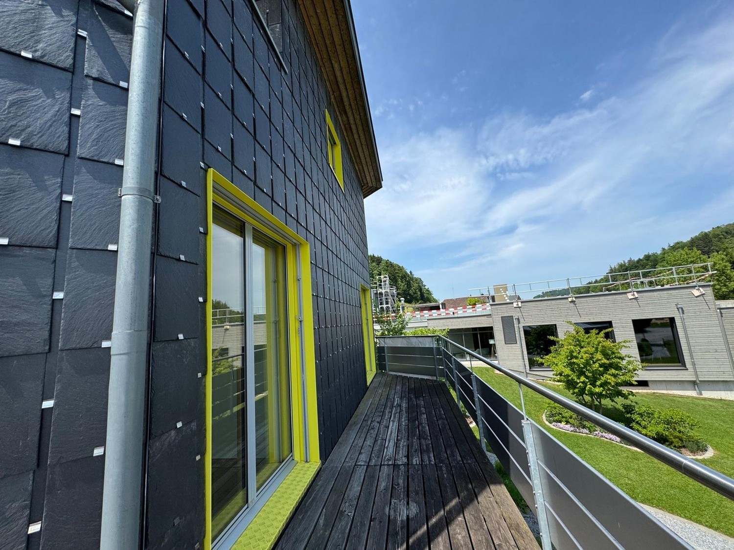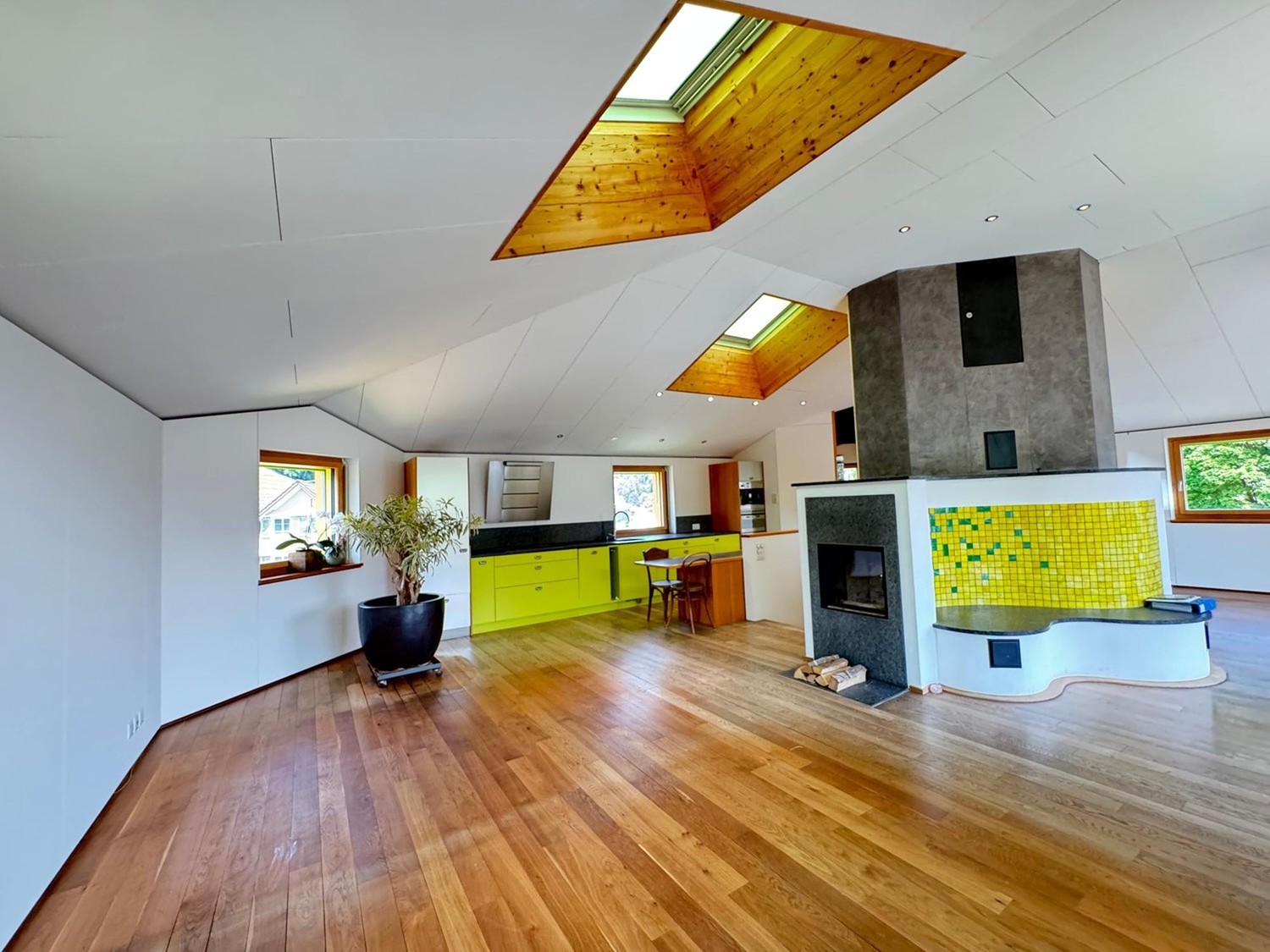 Dachgeschoss: Offener Wohn- und Essbereich mit Designküche, DU/WC, Terrasse mit Weitblick