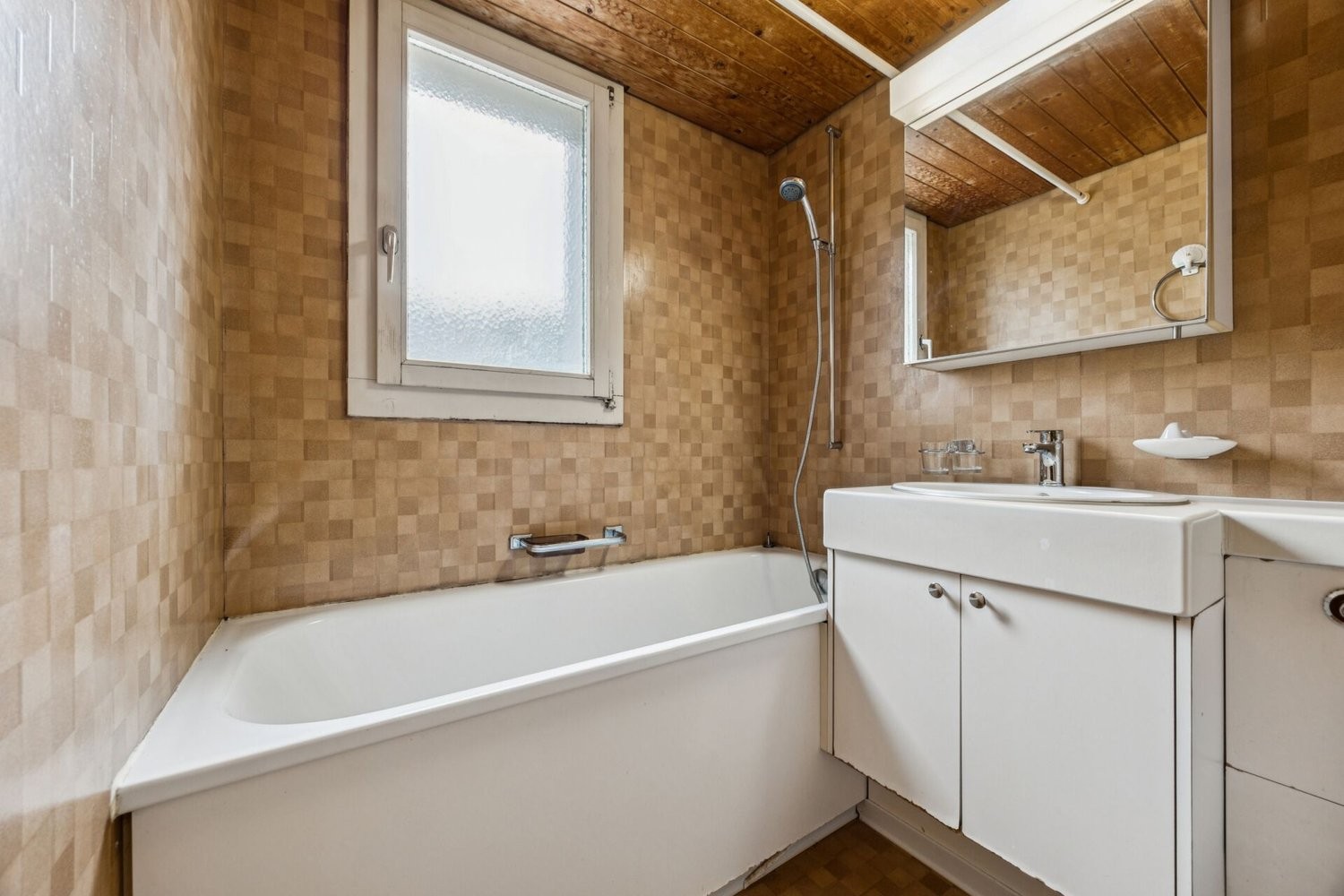 Das Badezimmer mit Linoleumboden ist funktional gehalten und könnte im Rahmen einer Renovation modernisiert werden. Die bestehenden Holzfenster mit Fensterläden sorgen für einen charmanten Altbaucharakter, während die Heizungsanlage 2013 auf Fernwärme umgestellt wurde und somit bereits heutigen Standards entspricht.