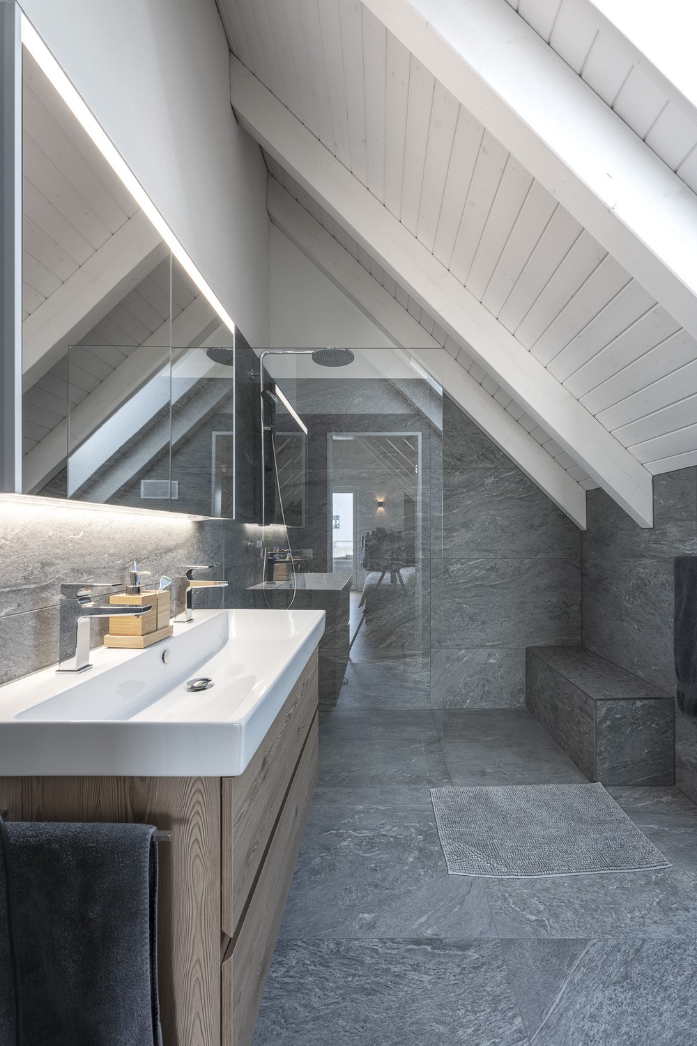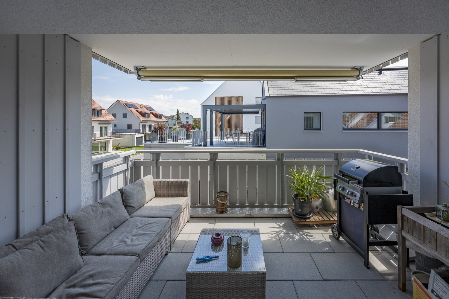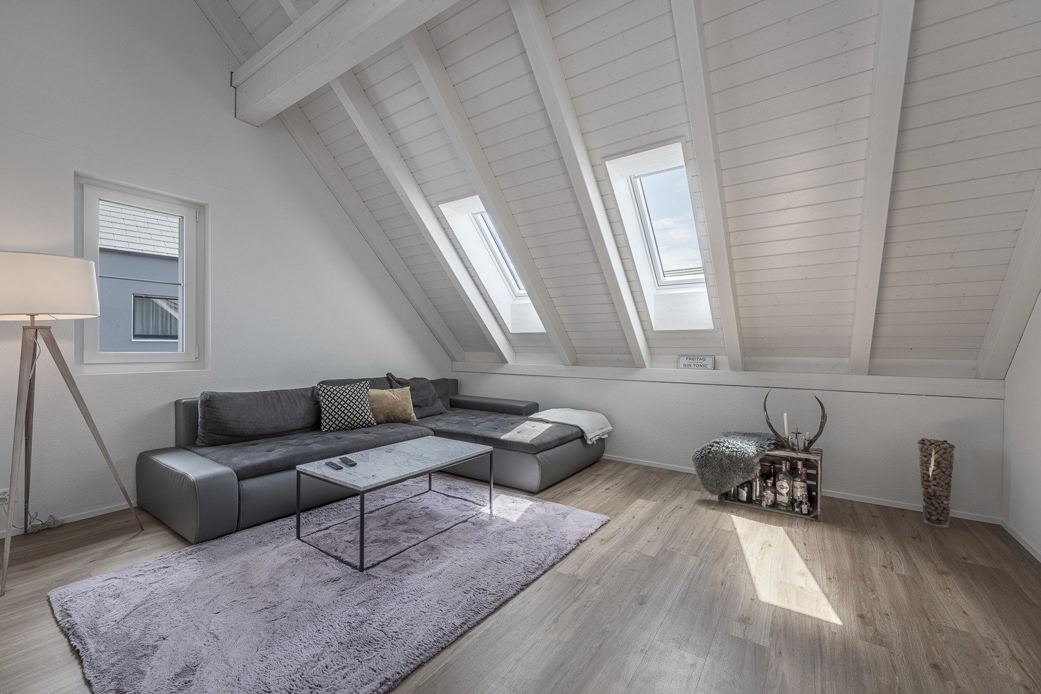 Die grosszügige Galerie kann als Büro genutzt werden oder bietet Platz für Ihre eigenen Wohnwünsche. Die hellen Sichtbalken schaffen zusätzlich eine warme Atmosphäre. Der sonnige Balkon lädt zum Verweilen ein.