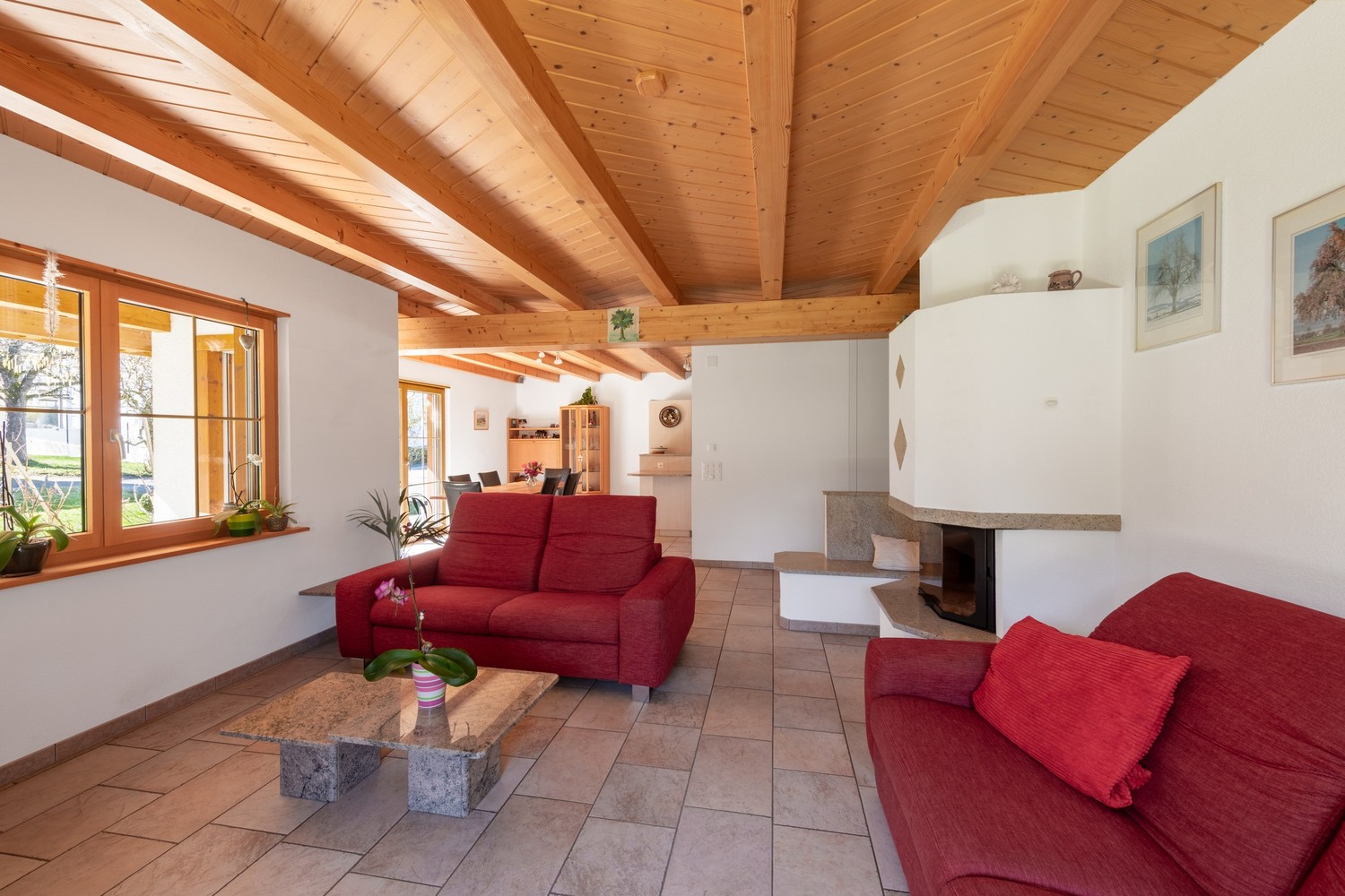 Wohnzimmer mit Warmluft-Cheminée: Das geräumige Wohnzimmer verfügt über ein Warmluft-Cheminée, das Wärme verbreitet und eine behagliche Atmosphäre schafft. Die integrierte Sitzbank mit Rückenheizung sorgt an kalten Tagen für viel Gemütlichkeit.