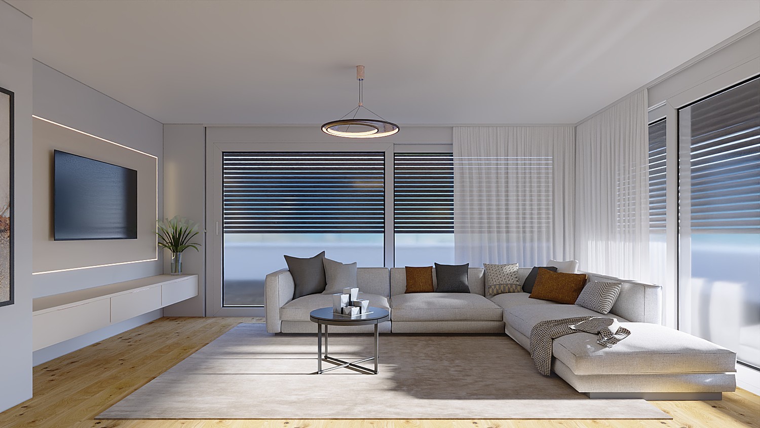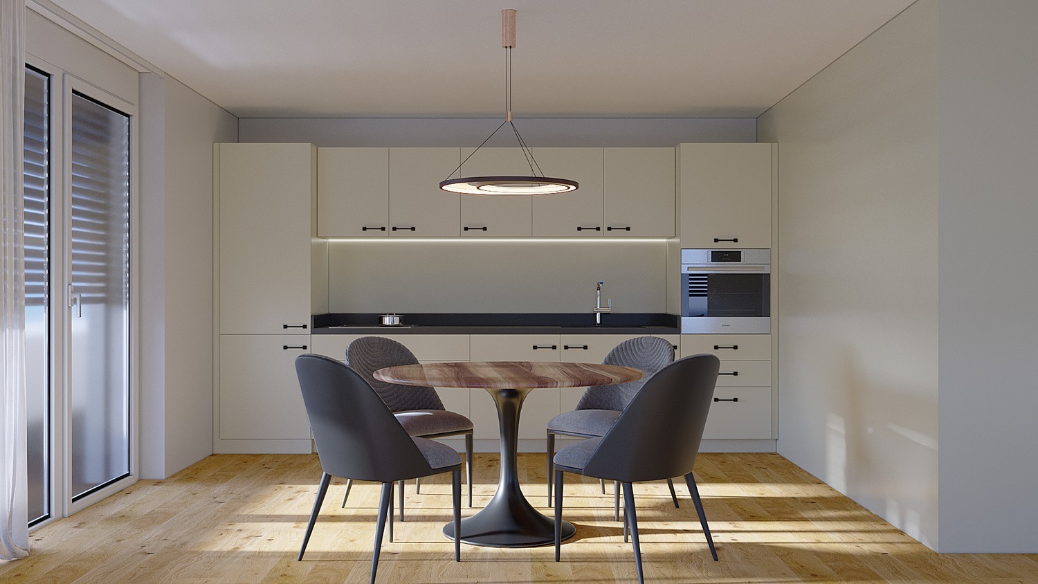 Die Wohnung ist mit einem durchdachten Farb- und Materialkonzept ausgestattet: gebürsteter Eichenparkett, helle Wandfarben (RAL 9016), edle Keramikplatten in den Nasszellen und hochwertige Holz-Metallfenster mit 3-fach Verglasung