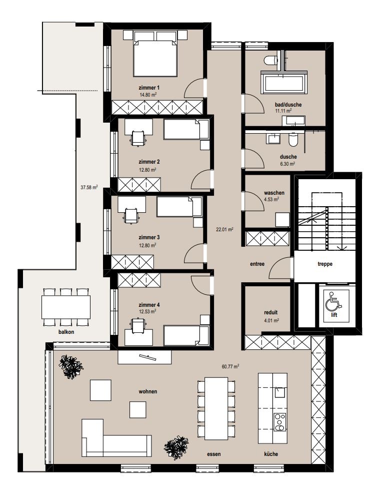 Das Projekt differenziert sich unter anderem durch die privilegierte Lage mit toller Aussicht und die grosszügigen Wohnflächen (5.5-Zimmerwohnung, 190 m2).
