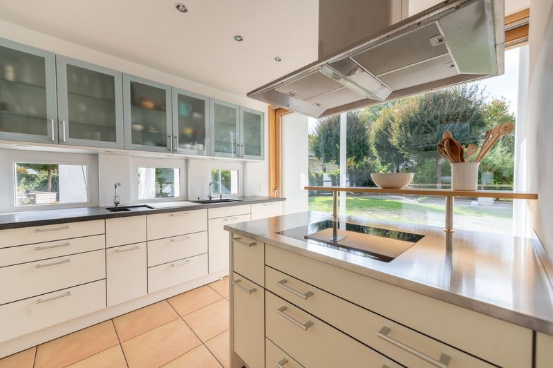 Moderne, offene Bulthaup Design Küche mit Blick in den Garten