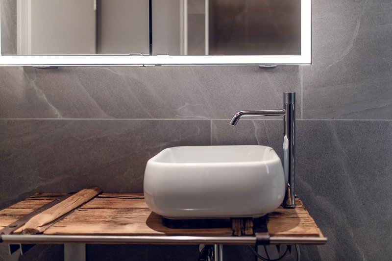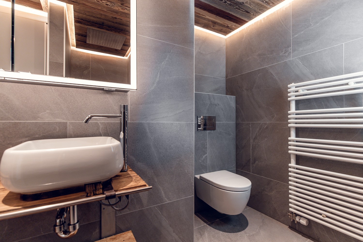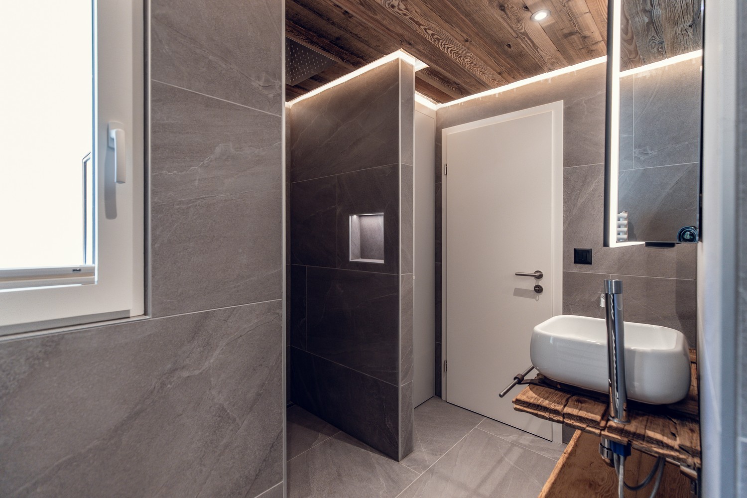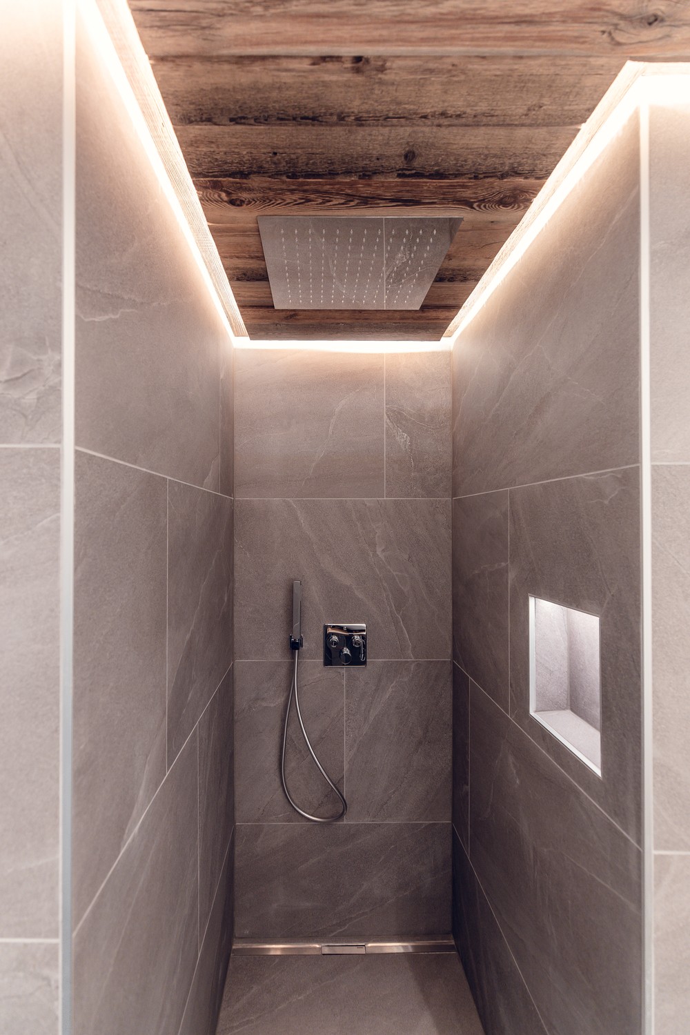 ● Stilvolles Badezimmer mit Regendusche, grossformatigen Keramikplatten und praktischem Einbauschrank für Waschmaschine & Tumbler