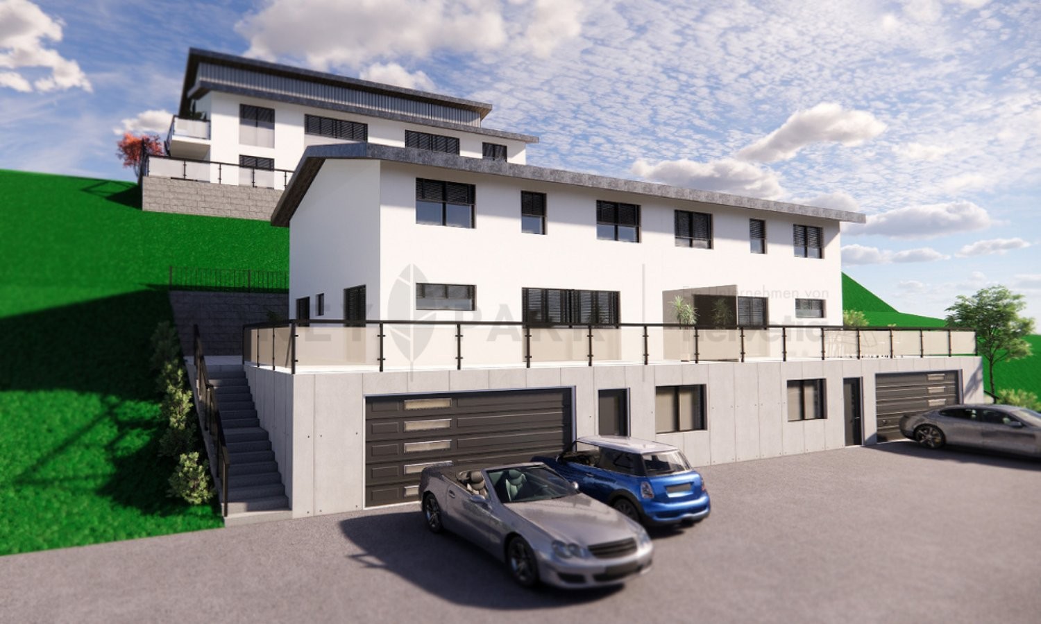 Die beiden Haushälften ergänzen sich perfekt für ein Mehrgenerationenhaus, das Platz für Familien und Grosseltern gleichermassen bietet. Es ist auch die perfekte Gelegenheit für zwei befreundete Familien nebeneinander zu wohnen. Jede Haushälfte bietet ein grosszügiges und lichtdurchflutetes Raumgefühl auf drei Etagen. Im Erdgeschoss befindet sich jeweils ein offener Wohn- und Essbereich mit direktem Zugang zur insgesamt 165 m² grossen Terrasse - ein Ort zum Geniessen und Zusammentreffen. Eine offene und moderne Küche können Sie sich nach eigenen Wünschen selbst zusammenstellen. Ergänzt wird das Raumangebot durch ein praktisches Büro- oder Gästezimmer sowie ein separates Gäste-WC.